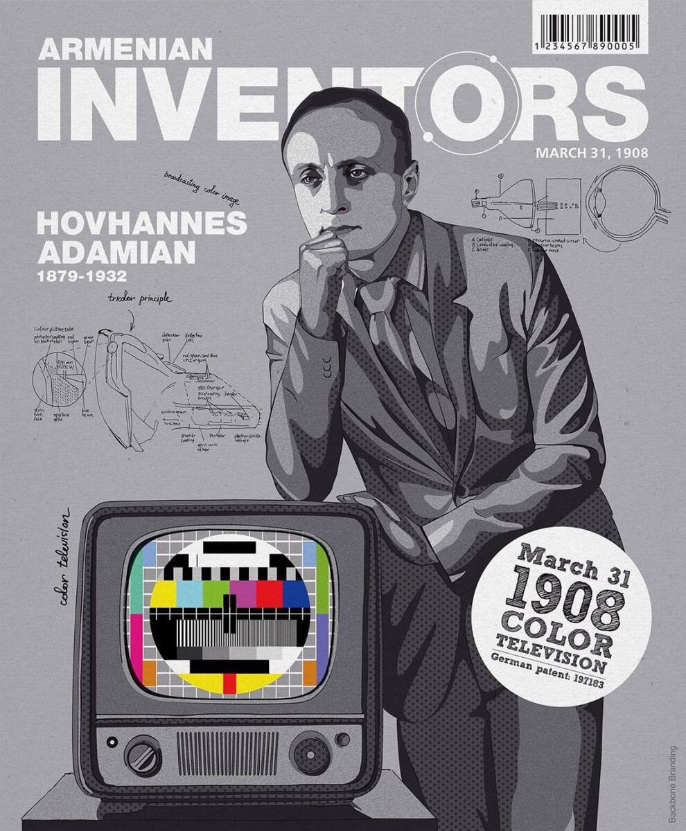 Ованес Адамян — изобретатель цветного телевидения Родился 17 февраля 1879 года в Баку в семье нефтепромышленника. После окончания реального училища в 1897 году уехал за границу, учился в Берлинском университете, затем учился и работал в Швейцарии и Франции, затем снова в Берлине. Имел пёстрый спектр интересов, увлекался разными вещами. Его коллеги-учёные и друзья говорили, что он разбазаривает свой выдающийся талант учёного, на что Адамян всегда отвечал: "Мир не делится лишь на чёрное и белое, есть много и других цветов". И чтобы доказать это, в результате долгих экспериментов в 1907 году изобрёл первое в мире цветное изображение на экране, патент на которое получил в 1908 году в Германии, а чуть позже и в Великобритании. В 1913 году переехал в Россию. В 1918 году собрал первую в России установку, способную демонстрировать чёрно-белое изображение (статичные фигуры), что было большим шагом в развитии телевидения. В 1925 году получил патент на трёхцветную электромеханическую систему теле