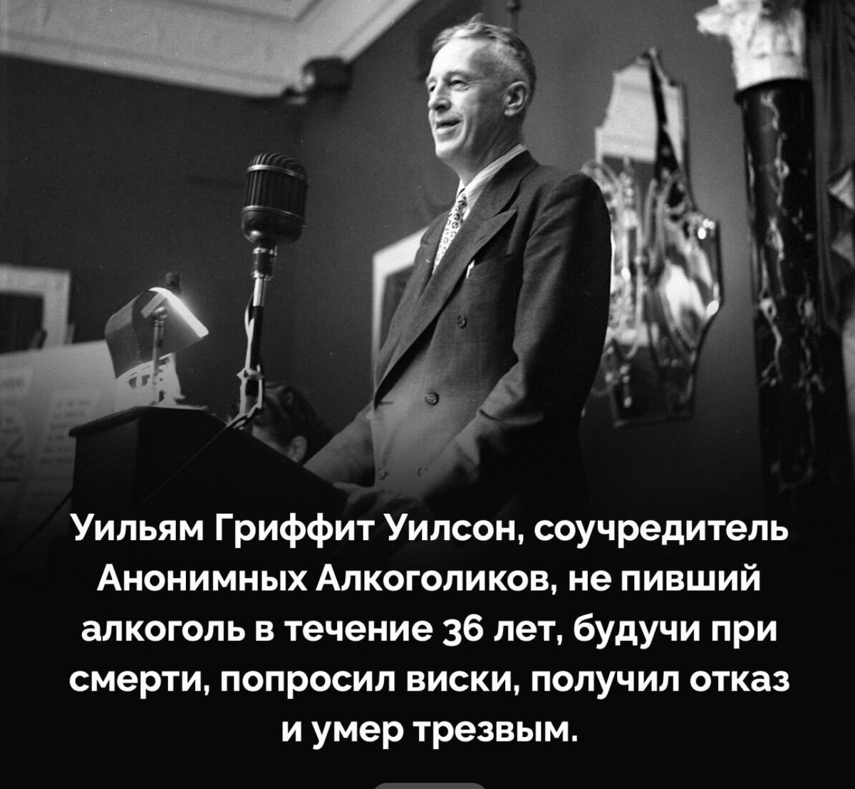 Но я сейчас не о том, что зависимость это следствие (симптом) и не о причинах (синдром). Даже не о том, что это можно исправить. Натолкнуло меня на написание этой статьи история окончания жизни одного из создателей это организации. Уильям Гриффит Уилсон, соучредитель