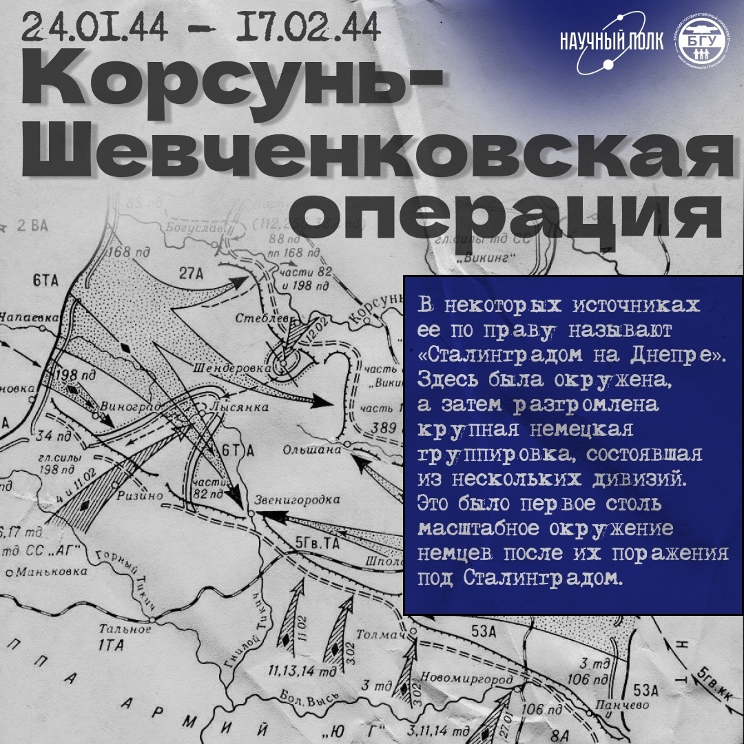 Корсунь-Шевченковская операция вошла в историю Великой Отечественной войны как один из блестящих образцов советского военного искусства по окружению и уничтожению крупной группировки врага. Ее по праву называют «Сталинградом на Днепре».