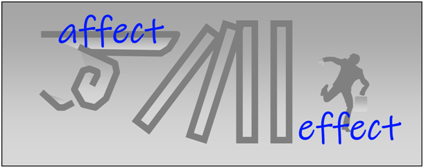 Если объяснять то же самое терминами грамматики, можно сказать, что глагол affect принимает прямое дополнение, обозначающее объект на который оказывается воздействие или влияние. А глагол effect принимает прямое дополнение, выражающее результат от воздействия на объект. При этом сам объект, подвергающийся воздействию, не упоминается. По сути дела, употребление слова effect в качестве глагола свидетельствует о стремлении английского языка к компрессии. Называется только причина (источник) и результат, а промежуточные звенья опускаются. Несколько примеров из оригинальных текстов. Обратите внимание на глаголы в скобках после знака равенства, которые могут прийти на замену в качестве синонимов глаголов affect (влиять оказывать влияние) и effect (добиваться, достигать, осуществлять).
