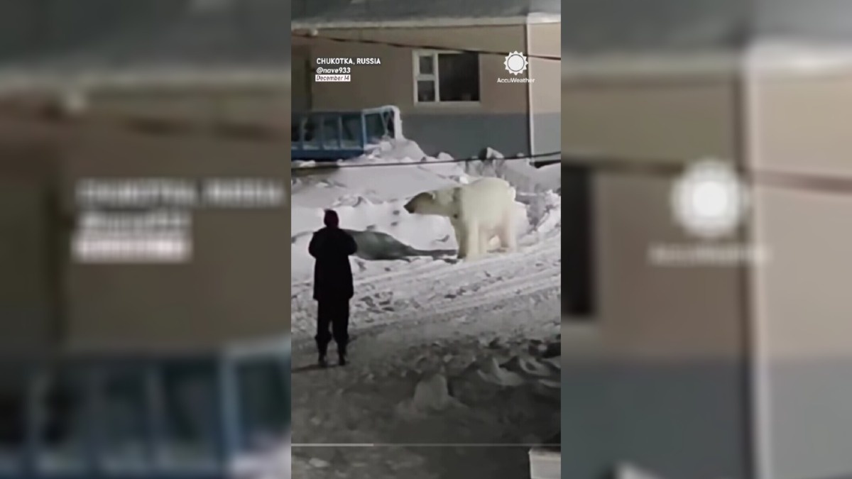 В TikTok набрало популярность видео, снятое на Чукотке, в котором запечатлена близкая встреча человека и белого медведя. На кадрах видно, как мужчина стоит на заснеженной улице в тёмное время суток, а прямо перед ним, буквально в нескольких метрах, «пасётся» огромный белый медведь.