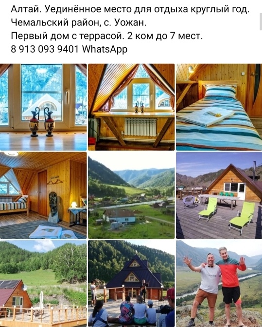 Горный Алтай - магнит для тех, кто проник в тайну красоты алтайской природы. Почитателей много не только в России, но и за рубежом. Уже много лет живёт семейная пара из Франции в Чемальском районе в селе Уожан. Построили дом, даже два, и приглашают туристов на отдых круглый год. Республика Алтай. Уединённое место для отдыха круглый год. Чемальский район, с. Уожан. На территории два дома. Зал для занятия йогой. Завтраки. Оздоровительный массаж. https://vk.com/album-15532675_306104788 https://wa.me/79130939401 WhatsApp Пишите количество человек и даты заезда и отъезда. 89130939401 WhatsApp #алтай #горы #природа #отдых #каникулы #йога_тур #Алтай_йога #чемал #отпуск #зима #лето #февраль #чемал #франция #туризм -- Отправлено из Mail для Android