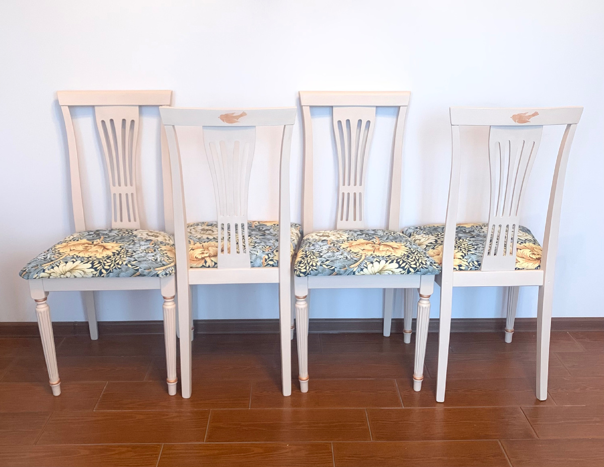 Вот и закончила я обновление старых стульев. Эти стулья достались мне при покупке дома. Они уже подвергались перетяжке, но сделано это было слишком неаккуратно. Ножки были раскачены и закреплены саморезами. В новом доме светлый интерьер и я задумала их переделку. Всё было разобрано, зачищено, ошкурено, склеено, окрашено меловой краской Декоратор цвет кунжут и покрыто акриловым матовым лаком thermo color. На обивку сидений использован поролон 3 см , синтепон и мебельная ткань гобелен У. Морриса. Декор в виде птичек сделан по трафарету золотым воском.