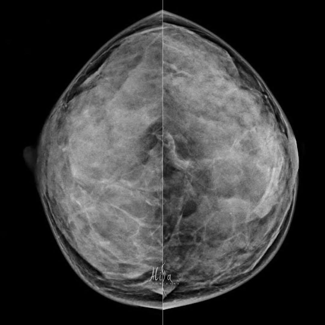 Жалоб нет. Плотный рентгенологический фон. Всё как мы «любим». Выход единственный - освоить вторую модальность. УЗИ Молочных желёз. И плотная вуаль больше не будет преградой. ⠀ Инвазивная карцинома G1 молочной железы. Экспрессия рецепторов эстрогенов – 8 баллов, прогестеронов – 8 баллов, c-erbB2/HER2/neu – 1+. Маркер пролиферативной активности Ki67 имеют ~ 10% клеток. ⠀ #кейс