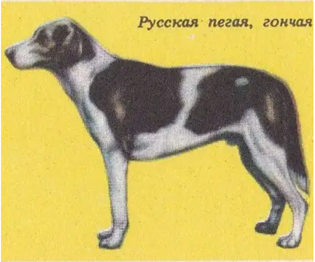 Русская пестрая гончая отличается от русской прежде всего своим окрасом: по белой рубашке у нее рассеяны пятна румяного или черного с румянами цвета. Высокопередость не является для нее типичной. Встречается иногда даже наклонность к низкопередости, что особенно бывает заметно у собак, имеющих близкую кровь фоксгаунда. Голова должна быть сухой, но некоторая прилобь допускается. Глаза темные, могут быть несколько на выкате по сравнению с русской. Колодка мощная, но без характерной для русской гончей загривины. Ноги костистые, с более круглой костью, чем у русской. Лапы следистые, но у собак, имеющих близкую кровь фоксгаунда, могут быть круглыми. Гон такой же, как у русской, но может иметь подвес; носится иногда более круто закинутым на спину. Прибылых (пятых) пальцев на задних ногах не должно быть. Настольная книга охотника-спортсмена. Том-2