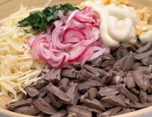Лук нарезаем полукольцами и маринуем. В миске приготовим маринад: Соединяем 100 мл кипячёной воды (тёплой, но не кипяток), 0,5 ч.л. соли и 2 ч.л. сахара, добавляем 2 ст.л. 9% столового уксуса. Всё размешиваем, чтобы крупинки соли и сахара растворились полностью. Нарезанный лук опускаем в маринад. Накрываем крышкой и убираем в холодильник на 40–60 минут. Куриные сердечки моем, очищаем и отвариваем до готовности. Для варки куриных сердечек для салата необходимо: Срезать с сердец жир, плёнки, остатки кровеносных сосудов. Также нужно удалить оставшиеся внутри сгустки крови. Это можно сделать надавливанием, но лучше надрезать каждое сердечко вдоль и тщательно промыть. Вскипятить воду в кастрюле и выложить в неё сердечки. Варить 10 минут на небольшом огне, после чего слить воду. Залить сердечки холодной водой и снова поставить на сильный огонь. После закипания убавить огонь, посолить, поперчить, положить лавровый лист. По желанию можно добавить другие специи или нарезанные лук и морков