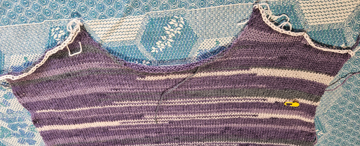Переделала скос плеча и горловину спинки. Сейчас вроде более менее правильно. Фото получились не очень хорошо, деталь пока не прошла ВТО и не заблокирована. Но ничего, думаю вы меня простите. Итак, как я это сделала. У меня на спицах, после вывязывания проймы - 112 петель. Я их поделила следующим образом; по 35 петель на плечи, 42 петли на горловину. 1 ряд (лиц): 1 кром, 45 петель лицевой гладью, 20 петель закрыть (1п снять, 1п лиц, протянуть через первую), 41п лиц. (Оставшиеся 5п оставляем на спице непровязанными) Поворачиваем работу. 2 ряд (изн): из первой петли делаем двойную, далее изнаночные, до горловины. 3 ряд (лиц): 5п закрыть, лицевые (недовязывая 4п+дв.п). Разворачивается работу 4 ряд (изн): дв.п, изнаночные, 1 кром. 5 ряд (лиц): 3п закрыть, лицевые (не довязать 4п+дв.п). Разворот работы. 6 ряд (изн): дв.п, изнаночные, 1 кром. 7 ряд (лиц): 2п закрыть, лицевые, не довязываем 4п+ дв.п Разворот. 8 ряд (изн): дв.п, изн, 1 кром. 9 ряд (лиц): 1п закрыть, лицевые