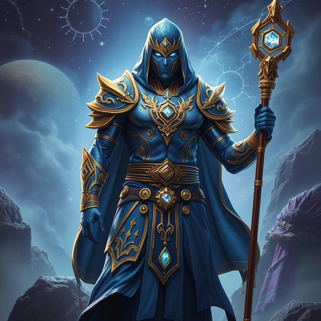 В сердце мистической вселенной, где тени ночи сплетаются с мерцанием звёзд, предстаёт перед нами величественный Космос — могущественный маг и хранитель древних знаний. Его образ заставляет сердце замирать от благоговейного трепета, а душу наполняет восторгом перед величием мира, который он олицетворяет. Космос облачен в богато украшенные доспехи, переливающиеся глубокими синими тонами, словно сама ночь облекла его своей мантией 🌌💙. Золотые акценты на его броне и посохе добавляют королевский шик, подчеркивая его высокий статус и необыкновенную силу. Синяя кожа мага и его светящиеся глаза создают ощущение, что он — часть этой вселенной, её живой дух, хранящий её тайны 👁️💫. Его поза и выражение лица внушают ощущение безграничной власти, мудрости и загадочности. Он стоит, словно гора, уверенный в своих силах, готовый встретить любые испытания, которые приготовила ему судьба. Этот воин не просто защитник, он символ бесконечности и гармонии между силами природы и космоса. В его руке виде