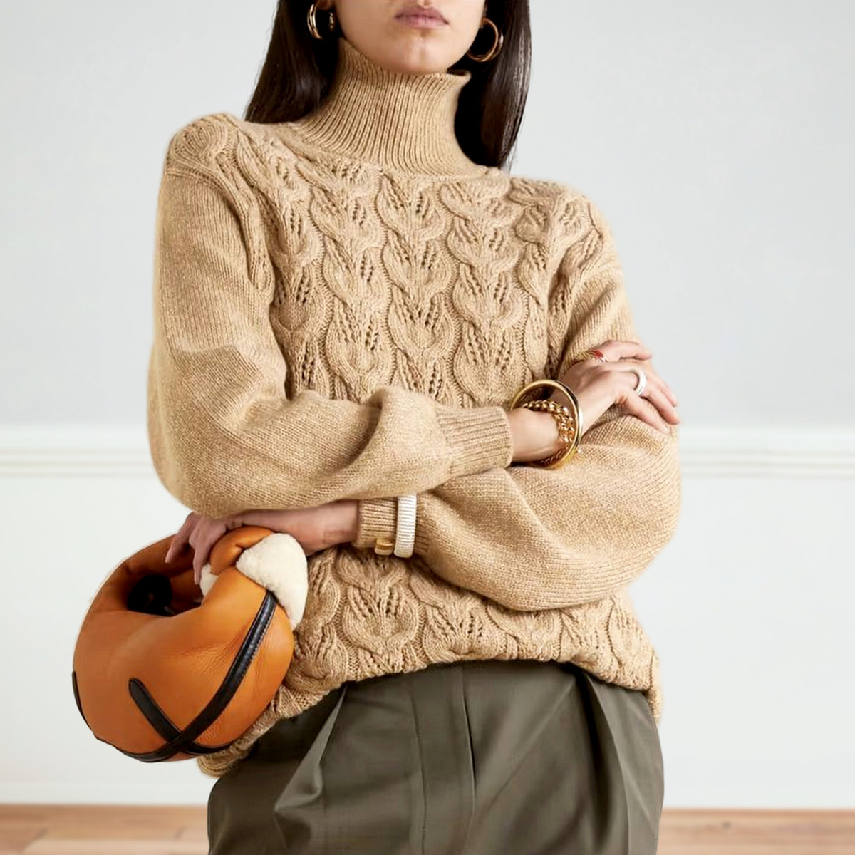 Эффектный песочный свитер оверсайз с оригинальными ажурными косами от знаменитого итальянского бренда Loro Piana. В оригинальном составе кашемир, но мы с вами возьмём пряжу попроще (если у вас есть возможность вязать из кашемира, то дерзайте).