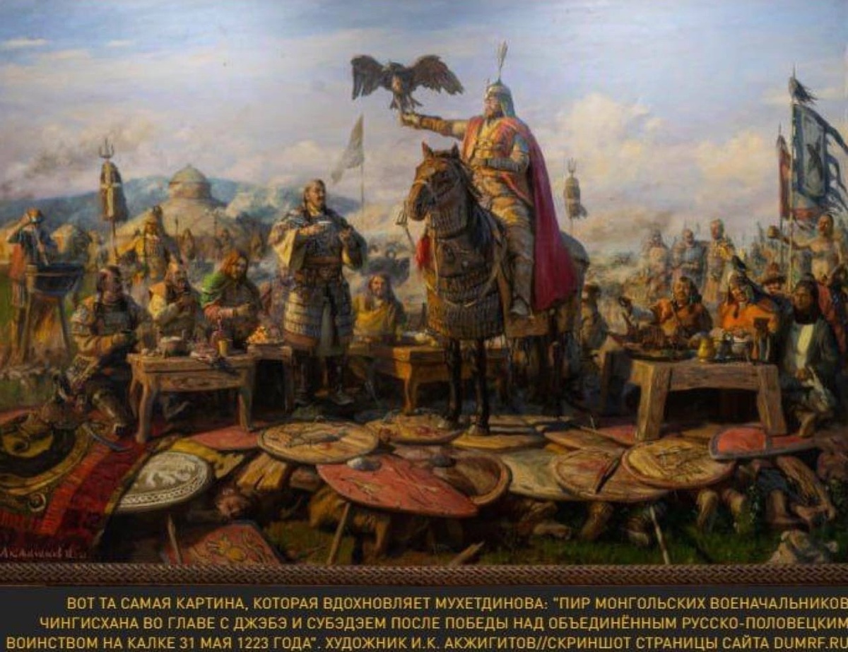 «На картине, запечатлевшей итог битвы на Калке и вызвавшей возбуждение в обществе, предки моего народа тюрки-половцы изображены не в рядах монголов, празднующих свой триумф, а под их щитами, ведь славяне и тюрки в этой битве сражались вместе против захватчика в лице монгольской армии под предводительством Субэдэя и Джэбе. Это – часть нашей совместной истории. Не доводилось встречать обвинения в русофобии художников Илью Репина за его картину «Иван Грозный и сын его Иван 16 ноября 1581 года» или Василия Верещагина