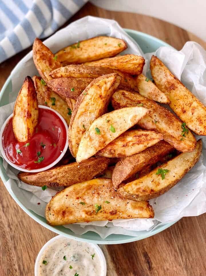 Картофель по-деревенски — это вкусное и простое блюдо, которое подходит как гарнир к основному блюду, так и как самостоятельная закуска. Этот рецепт порадует вас своей простотой и отменным вкусом. Давайте приготовим картофель по-деревенски! - 1 кг картофеля (желательно молодой) - 3-4 столовые ложки растительного масла (оливковое или подсолнечное) - 1-2 чайные ложки соли - 1 чайная ложка черного перца - 1 чайная ложка паприки (по желанию) - Чеснок (3-4 зубчика, по желанию) - Свежая зелень (петрушка или укроп, для подачи) - Тщательно вымойте картофель под проточной водой, чтобы убрать землю и грязь. Если картофель молодой, его можно не очищать, а просто хорошо промыть. - Нарежьте картофель дольками (примерно 4-6 долек на клубень, в зависимости от размера). - В глубокой миске смешайте растительное масло, соль, черный перец и паприку. Если вы используете чеснок, мелко нарежьте его или пропустите через пресс и добавьте в маринад. - Перемешайте все ингредиенты до однородного состояния. - Доб