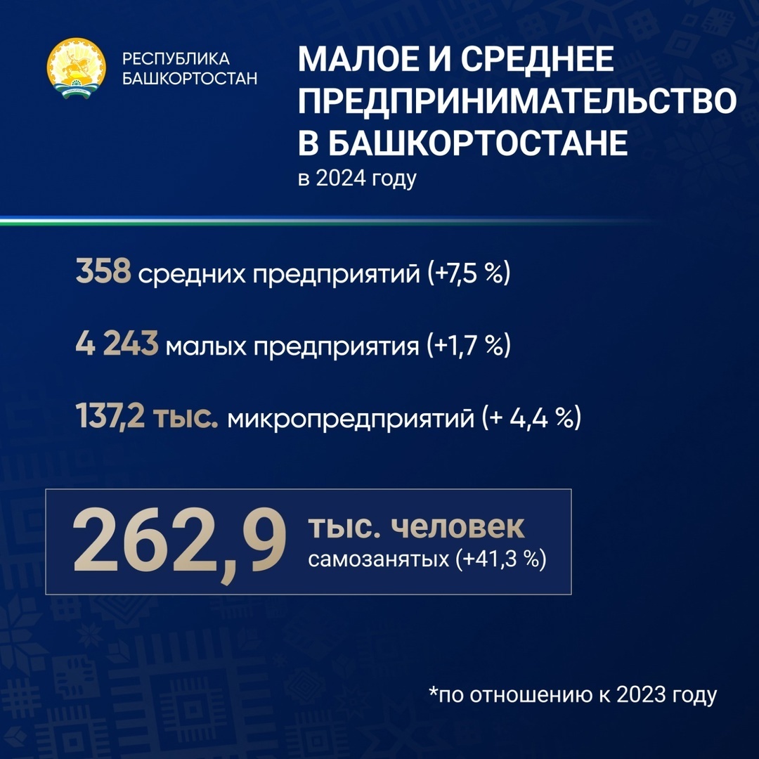 В малом и среднем бизнесе Башкортостана занято 593,3 тысячи человек. За прошлый год в республике увеличилось число малых и средних предприятий, микропредприятий, а также выросло количество самозанятых. Радий Хабиров отметил, что этот показатель отражает динамику развития экономики региона – бизнес активно работает, производит востребованные товары и оказывает услуги жителям республики. – Мы многое делаем для того, чтобы поддержать предпринимательскую инициативу. Стараемся помогать и тем, кто только начинает, и тем, кто уже твердо стоит на ногах и думает о развитии бизнеса, – сказал глава региона. В 2024 году общий объем господдержки бизнеса превысил 1 млрд рублей, из которых более 445 млн рублей направлены в рамках национального проекта «Малое и среднее предпринимательство». В регионе продолжают действовать программы поддержки на республиканском и муниципальном уровнях, работают институты развития бизнеса, а в каждом районе и городском округе действуют бизнес-шерифы. Чтобы оценить эффе