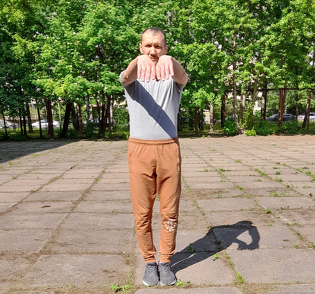 Форма Чам Кью начинается с растягивания плеч, так же, как и в Сио Лим Тао. Прежде чем начать делать форм у выстраиваем структуру тела. Нам необходимо встать ровно, руки свободно висят вдоль тела, прижаты к телу. Приняв правильное положение, начинаем первое движение. Поднимаем две руки вверх-вперед по средствам вращения в плечевых суставах, руки в локтях не сгибаем. Локти смотрят вниз. Поднимаем до уровня подбородка вашей условной тени стоящей впереди. Кисти максимально расслаблены. Движение делается по средствам работы плечевого сустава, но исходит от локтя. В конечном положении поднятия, руки как бы тянутся впереди. Наша задача в этом упражнении, максимально растянуть плечевые суставы. Это важно для нужной максимальной дистанции вашего удара. Не растянутые плечевые суставы будут мешать вытянуть руку при ударе на максимальную дистанцию. А в бою важен каждый миллиметр. После растягивания плечевых суставов, сжимаем кулаки с максимальной силой, продолжая удерживать максимальное растяжение