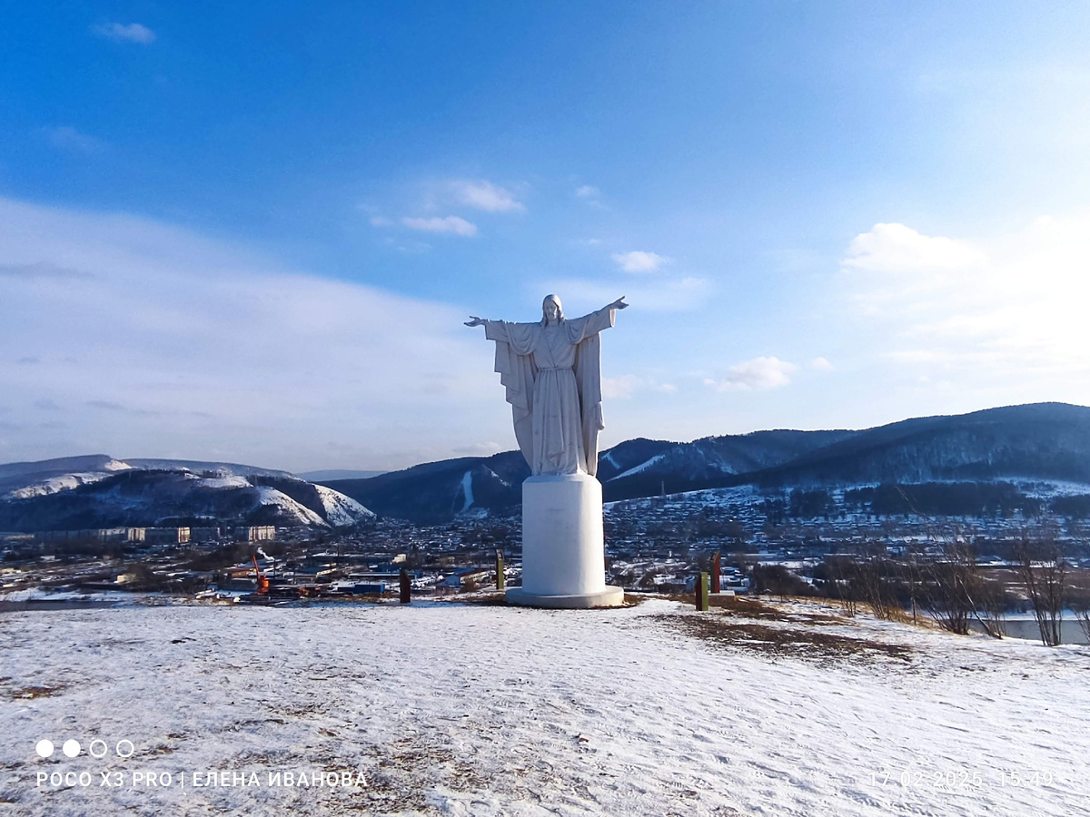 Сегодня мои младшие дети, дочь с зятем, вдруг решили, что я скучаю в одиночестве и меня срочно необходимо навестить, спасибо, что предупредили заранее. Предстояло мне культурное мероприятие — ознакомиться с локацией, где расположена статуя Иисуса Христа. Осенью 2022 года, а точнее 5 октября, как раз в день моего рождения в Красноярске появилась новая достопримечательность. Внешне она похожа на всемирно известный символ Рио-де-Жанейро, но в 140 раз меньше. Если добавить основание, то её высота составит примерно 15 метров. - Это не идентичный образ статуи из Рио-де-Жанейро — у неё более суровые черты лица. Мне захотелось создать образ Спасителя, который можно увидеть на православных иконах, — поделился Виталий Ян-Вин-Тин (скульптор). — Два года она пылилась на складе, пока её не приобрели благотворители из Рыбинского района, чтобы подарить Красноярской епархии. Было решено установить скульптуру Христа с распростёртыми руками на Красивом берегу у храма Новомучеников и Исповедников Российс