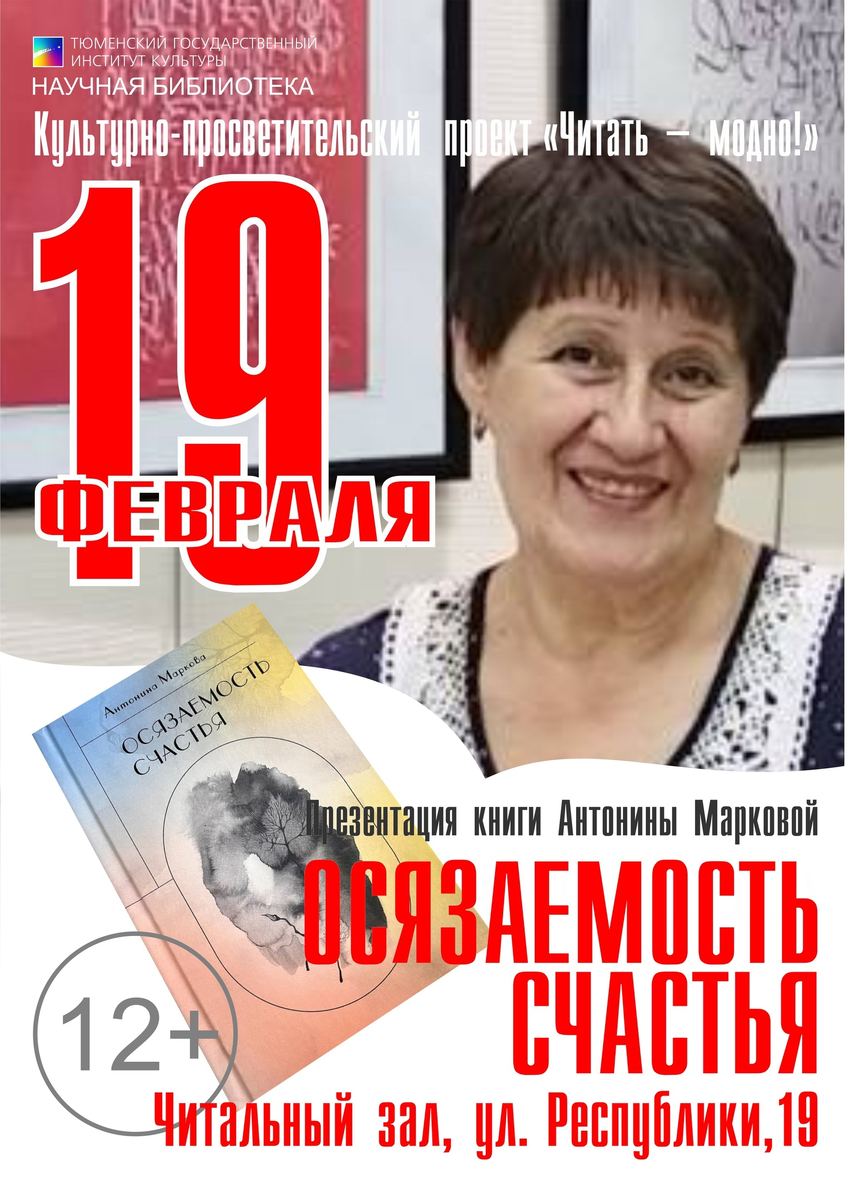 19 февраля в 15:00 в читальном зале научной библиотеки ТГИК (ул. Республики, 19, ауд. 109) в рамках культурно-просветительского проекта «Читать – модно!» состоится презентация нового поэтического сборника Антонины Марковой «Осязаемость счастья» (2024).