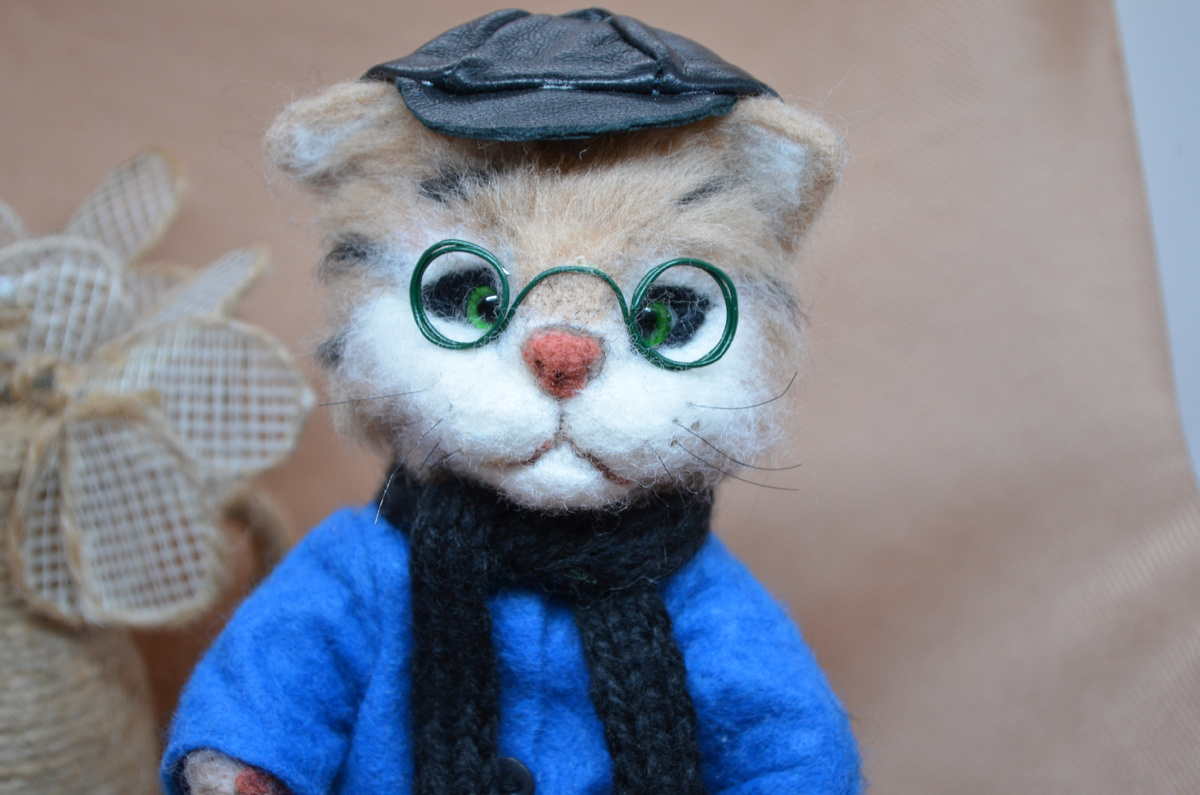 Это кот Иннокентий, он очень важный и у него всегда много дел. Волшебный чемоданчик он всегда носит с собой. Иннокентий ищет дом. Скульптура выполнена в технике сухое валяние из овечьей шерсти. Высота 19 см. Проволочный каркас, одежда несъёмная. Иннокентий пока здесь, но вы можете забрать его к себе