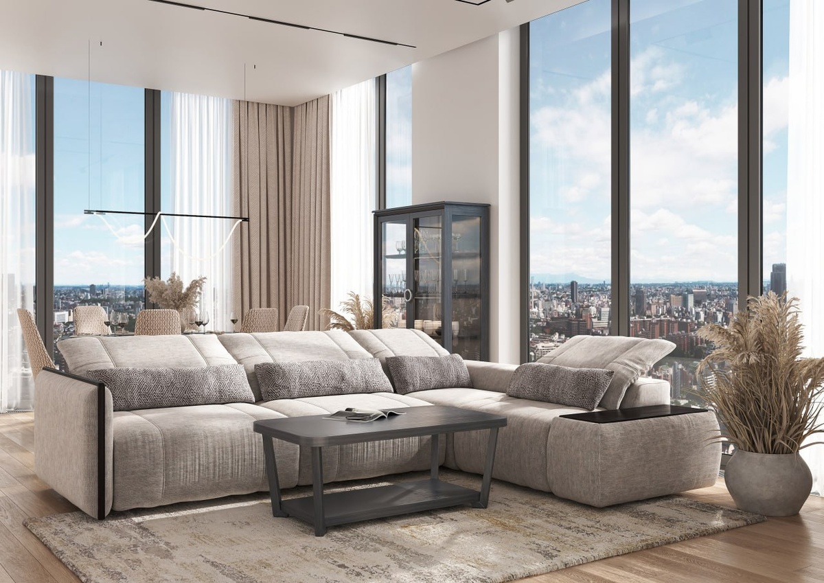 Продолжаем знакомство с нашей новой коллекцией мебели от фабрики «EVANTY»! Сегодня наш обзор будет посвящен топовой модели - модульной системе «Гранд», которая уже завоевала немало сердец, а после сегодняшнего обзора этот список однозначно пополнится! Итак, «Гранд»! Грандиозно функциональный, трендовый, удобный! В первую очередь стоит отметить действительно большой выбор модулей, благодаря которому вариативность комплектаций поражает - от кресла-качалки до огромного П-образного дивана с большим спальным местом, встроенной акустической системой, электрореклайнерами, беспроводной зарядкой! Диван раскладывается с помощью встроенного механизма «слон», который отличается идеальной ровностью и удобством спального места, поскольку с двух сторон имеется возможность подойти к нему. На выбор представлены два варианта ширины спального места - 1500 и 2000 мм. В базовой комплектации механизм раскладывается вручную, однако чаще наши покупатели выбирают электропривод - управление раскладыванием с пом