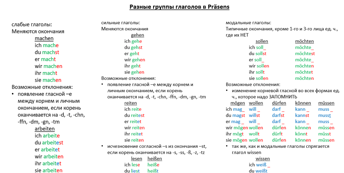 Все возможные группы глаголов немецкого языка в настоящем времени Презенс