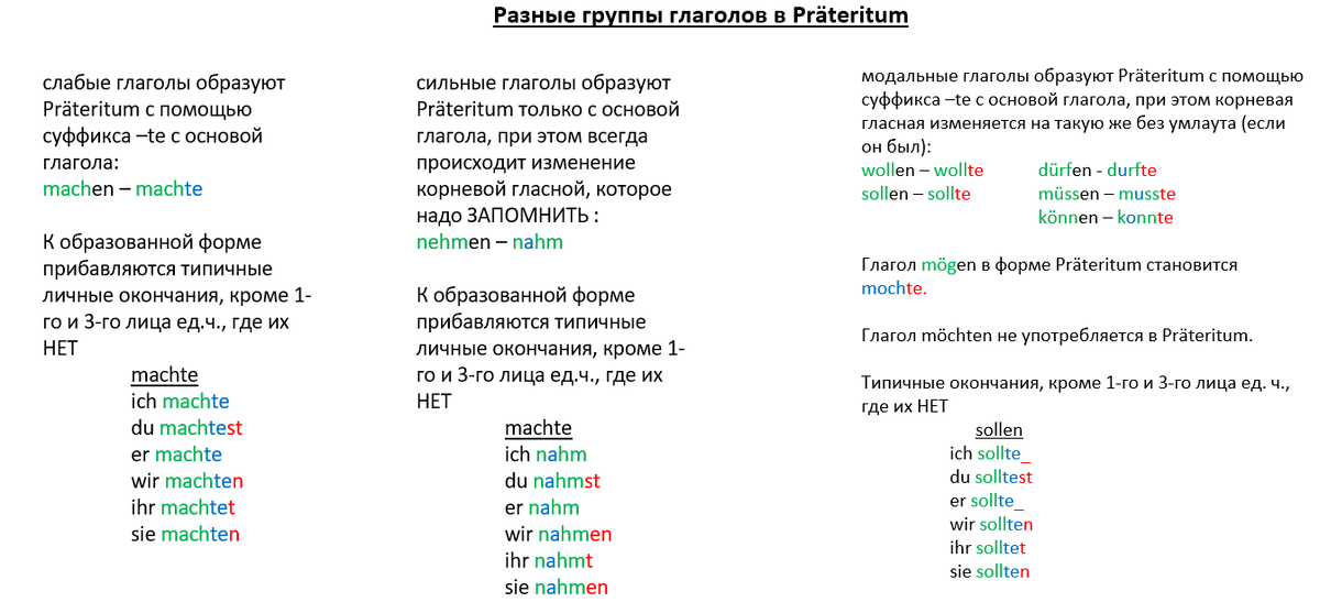 Все возможные группы немецких глаголов в прошедшем времени Претеритум
