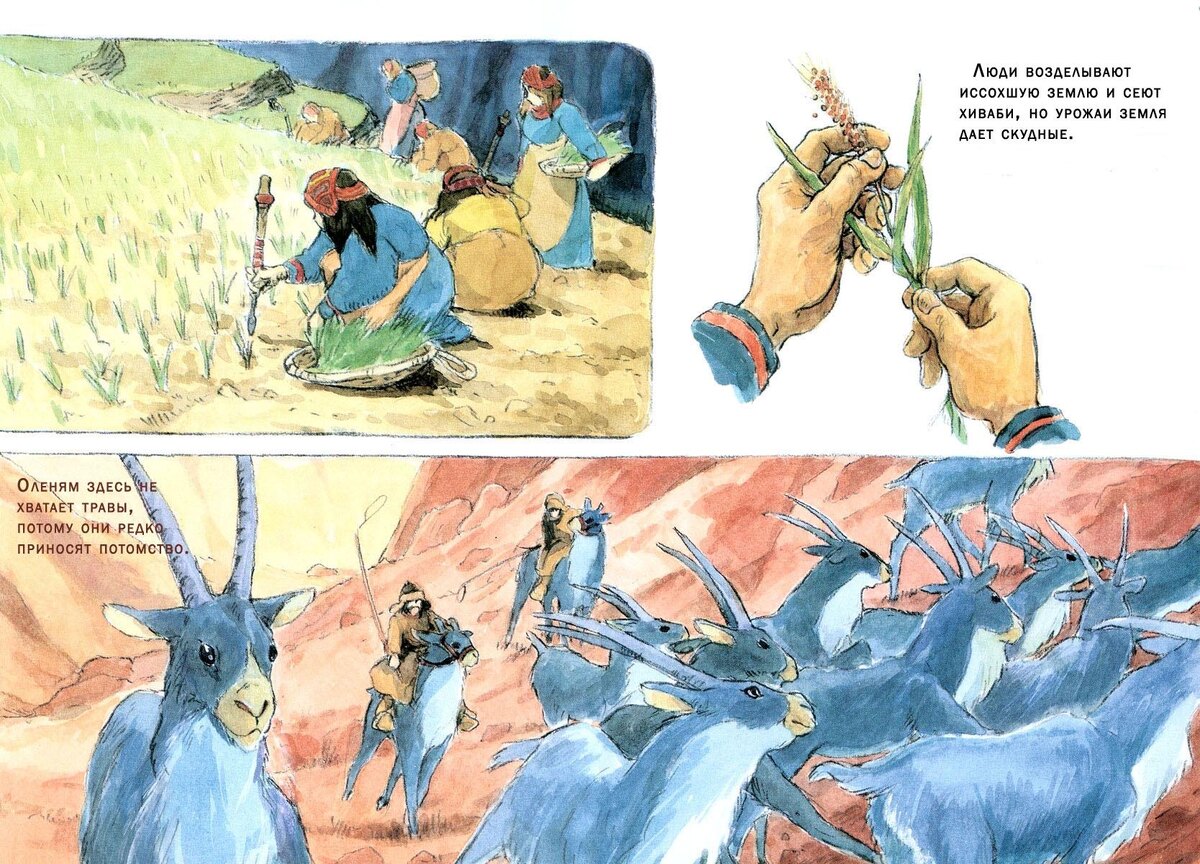 Вся манга цветная и выполнена акварелью, при этом текста в ней не так много. Миядзаки не скупится на большие кадры с пейзажами, которые передают атмосферу истории. Реальность, которую он создаёт, одновременно вызывает страх и восторг. И невольно возникает вопрос – а как в этом гигантском, пустом, недружелюбном и одиноком мире ощущает себя совсем юный Сюна, в одиночку отправляющийся в путь?