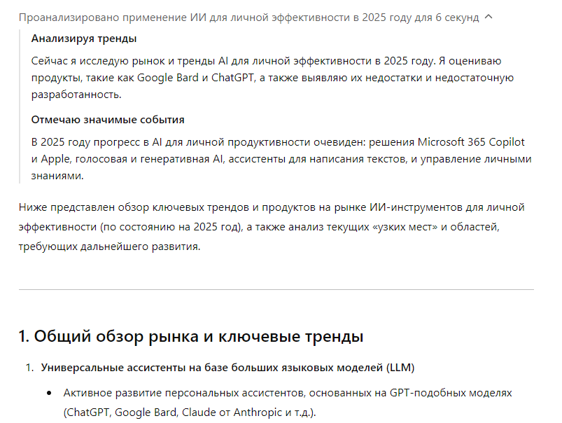 Мы дали им одинаковое задание: проанализировать тренды 2025 года в сфере ИИ-инструментов для личной эффективности. При этом намеренно не ограничивали их конкретными аспектами, позволяя каждой модели сфокусироваться на том, что она считает наиболее важным.