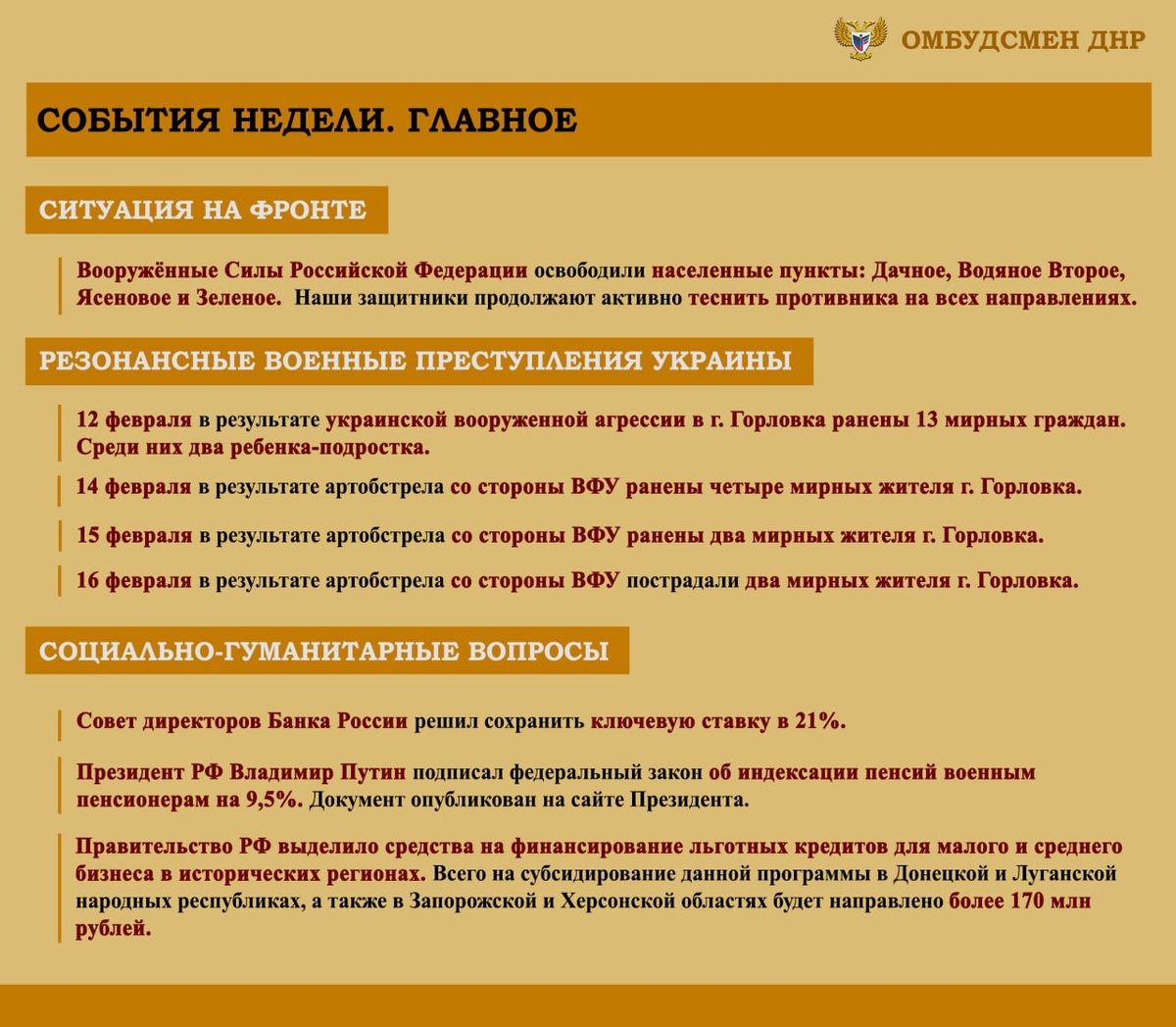 Полная версия: https://ombudsman-dnr.ru/obzor-soczialno-gumanitarnoj-situaczii-slozhivshejsya-na-territorii-doneczkoj-narodnoj-respubliki-vsledstvie-voennyh-dejstvij-v-period-s-10-po-16-fevralya-2025-g/