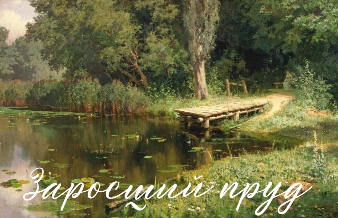 Картина "Заросший пруд" русского художника Василия Поленова написана аж в 1879 году, когда он навещал своих родителей в деревне в деревне Петрушки под Киевом. Пруд точная копия пруда в деревне Ильюшино Брянской области Почепский район, он наверно там до сих пор есть. Был 1990 год мне 9 лет, сестре 7, мы приехали отдыхать к нашей бабушке летом. Жара помню сильная стояла, зной такой аж от жары. Наши братья потащили нас кататься на тарзанке. Мы прошли пару домов, колодец и вот он пруд перед глазами. Точная копия пруда изображена на картине и тогда очень похоже, такой же деревянный понтон, все деревья растения совпадают, даже кувшинки в воде такие же, лишь отсутствует та сама тарзанка, она была приделана как раз к этому толстому дереву, от него спускалась ветка и на ней висела верёвка с привязанной палочкой. Наверно наши дети и не знают, что это тарзанка, сейчас в каждом дворе цивильные качели ))) тогда не было, особенно в деревне. Все развлечения делали сами. Братья показывают нам с се