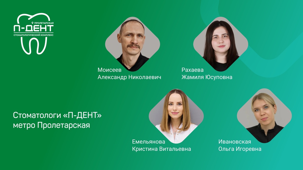 Более 13 лет мы заботимся о здоровье наших пациентов и благополучии сотрудников, сохраняя лучшие традиции, объединенные с инновациями. В нашей команде работают высококвалифицированные стоматологи-терапевты с общим стажем работы более 56 лет. Состав стоматологов-терапевтов "П-ДЕНТ" Пролетарская: Наши специалисты оказывают следующую стоматологическую помощь: Стоматология П-ДЕНТ на Пролетарской предлагает комфортное и качественное лечение для пациентов. Наши врачи всегда внимательны к потребностям каждого пациента и обеспечивают индивидуальный подход к каждому случаю. Мы используем только проверенные материалы и современное оборудование, чтобы обеспечить вам наилучший результат. Контактная информация Стоматология "П-ДЕНТ" м. Пролетарская ул. 1-я Дубровская, д. 1, к. 2 Как добраться: 1-ый вагон из центра, далее по указателю выход к 1-ой Дубровской улице по переходу далее 1-ый выход направо, на улицу, перейти дорогу по пешеходному переходу и повернуть направо, через 50 метров по лев