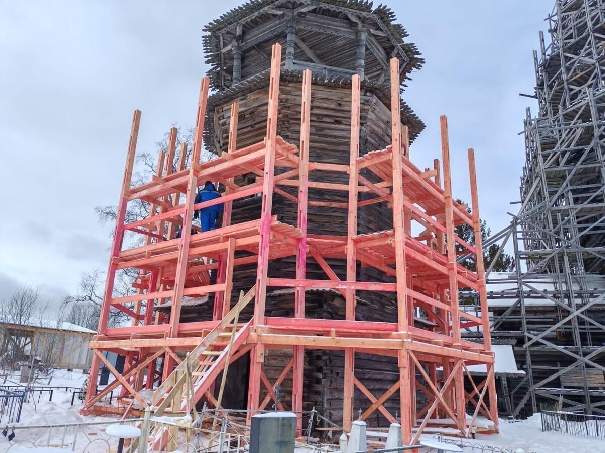 «Реставрация на Гиморецком погосте продолжается. Параллельно с работами по храму поднимаются леса вокруг колокольни. Строится дополнительный склад для хранения сруба, заготавливается зимний лес», – отметил Цой.