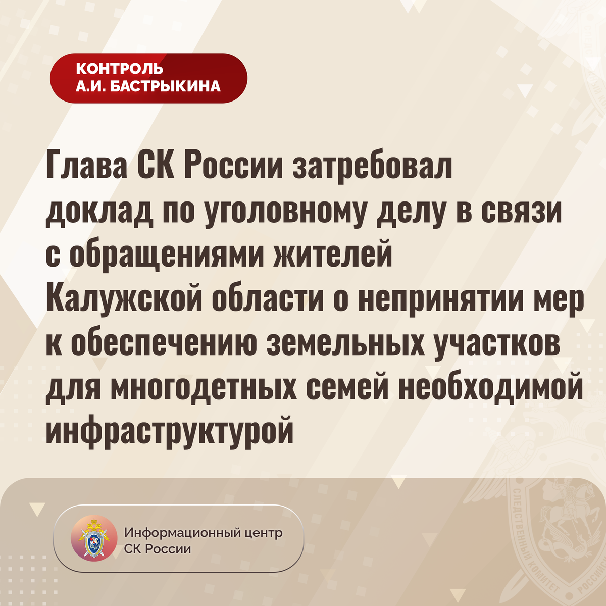 Глава СК России затребовал доклад по уголовному делу в связи с обращениями жителей Калужской области о непринятии мер к обеспечению земельных участков для многодетных семей необходимой инфраструктурой