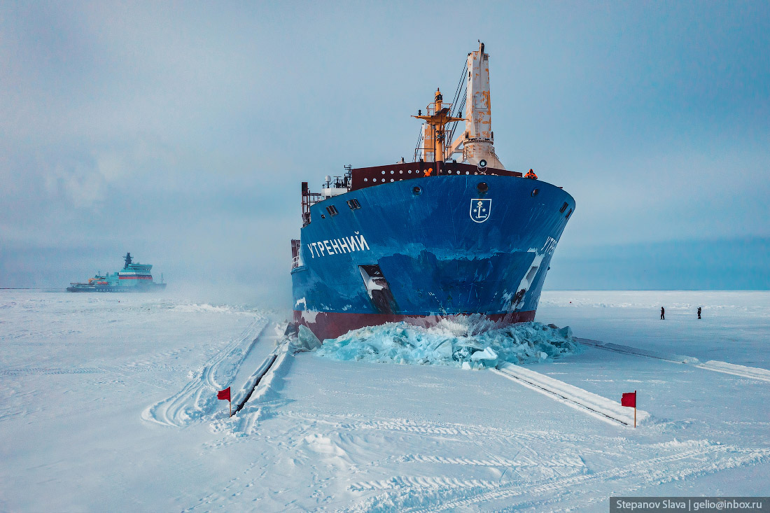 Арктика динамично развивается: запускаются новые проекты, строятся порты. Работа идёт круглый год. Отдельного внимания заслуживают операции по постановке судов на необорудованный берег — к ледовым причалам. Такие операции выполняются, когда река покрывается припайным льдом. Организация ледовых причалов — трудоёмкая задача, требующая контроля за состоянием льдов, движением судов и процессом погрузки и выгрузки. 1. Ледовые причалы — по сути стоянки для судов посреди льдов, позволяющие оптимизировать многие процессы в условиях Арктики. Специалисты регулярно проверяют состояние и толщину льда, оценивают его крепость, целостность и способность выдержать многотонные грузы. 2. Ледовый причал Таналау. Находится в северной части Красноярского края, в устье реки Енисей. 3. Когда место для причала выбрано, ледокол прокладывает специальный подходной канал, по которому судно подойдет к месту выгрузки или погрузки. 4. Маршрут для движения судна размечают специальными красными флажками. 5. Подготовле