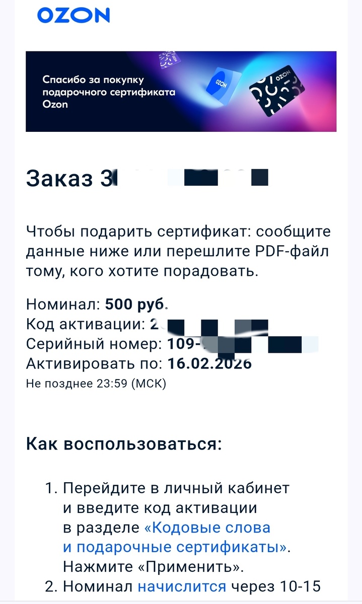 На электронную почту, к которой привязан личный кабинет Озона, приходит письмо с кодом активации сертификата, в нем - инструкция со ссылкой на раздел "Кодовые слова и подарочные сертификаты".