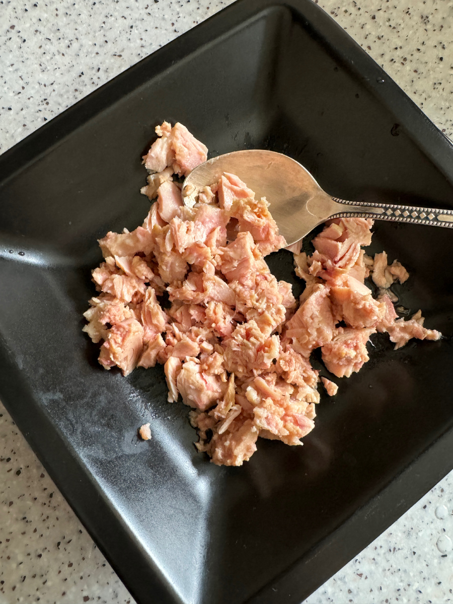 Одну банку консервированного тунца высыпаем в салатник. Добавляем горсть каперсов или мелко порезанных два соленых огурца. Тонкими полукольцами режем одну красную луковицу. Потом берем одно яблоко и режем тонкими пластинами. Обжариваем на оливковом масле лук, а через 2-3 минуты добавляем к нему яблоко. Обжариваем еще 4 минуты и добавляем к тунцу. Отвариваем два яйца и мелко режем. Я измельчаю с помощью вилки, так получается мельче. Добавляем в салат, немного соли и черного перца. Последний ингредиент - майонез, какой вам больше нравится - обычный, домашний, веганский или безлактозный. В указанных пропорциях получается столько салата, как на фото - две порции.