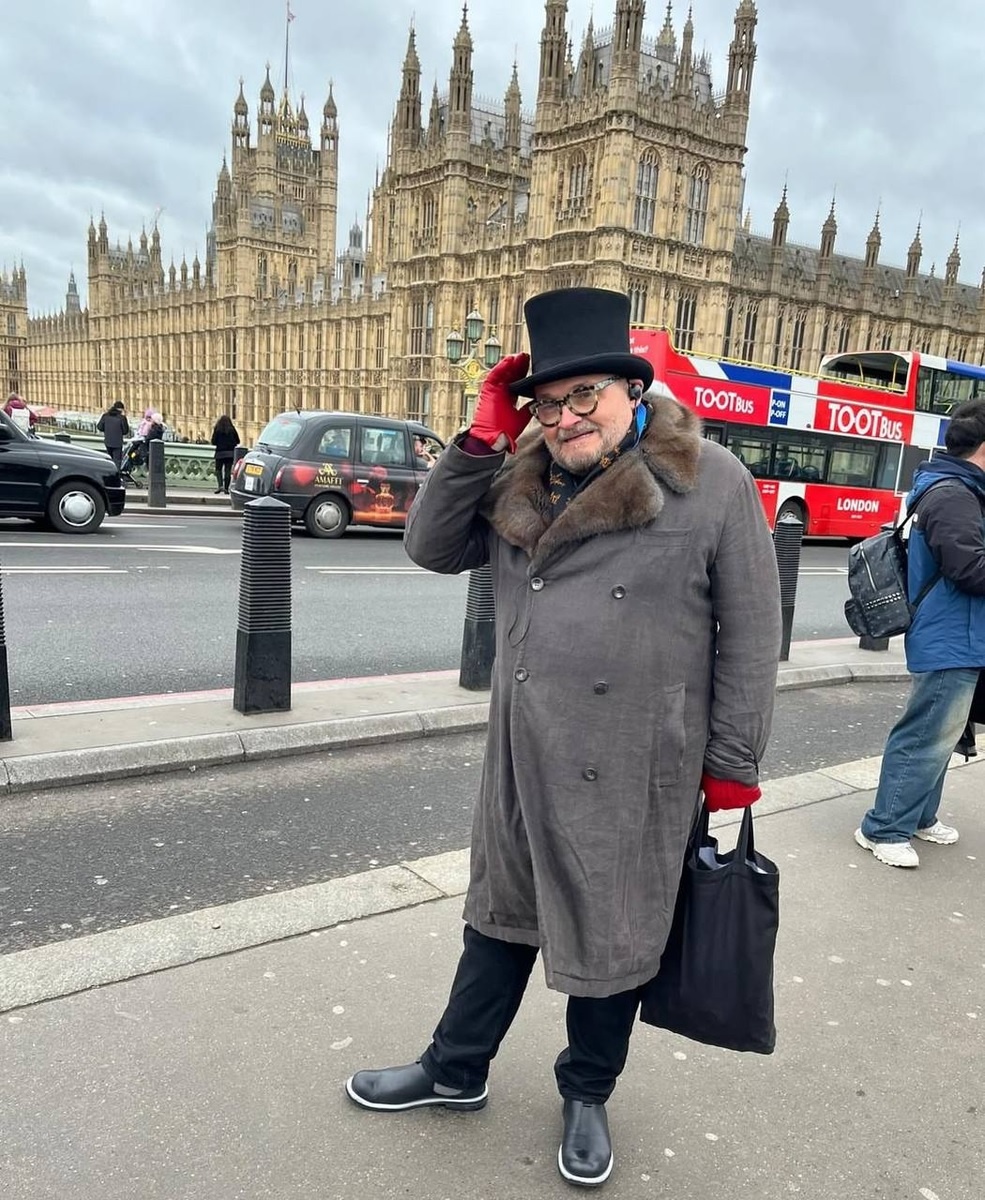 Патентованный российский модник приобрел пальтецо с блошиного рынка (см. потертый карман), ботинки ни к селу ни к городу, красные женские перчатки из кожзаменителя, матерчатая сумка завершает нелепый образ. И этот тип ругал российских мужчин, называя их уродами, неумеющих красиво одеваться. ха-ха, поглядите-ка на этого "красавца". Пестрый платок на шее вместо шарфа сильно диссонирует с помятым зимним пальто а-ля бомж. Выпендрежная белая подошва из термоэластопласта. Обувь на ТЭП в Москве даже мигранты не носят. Как же низко пал дизайнер моды Васильев, сваливший за бугор. Вот что нищета с человеком делает. Возможно, он этот стиль называет "Буржуа, бежавший из большевистской России". В общем, похоже)))