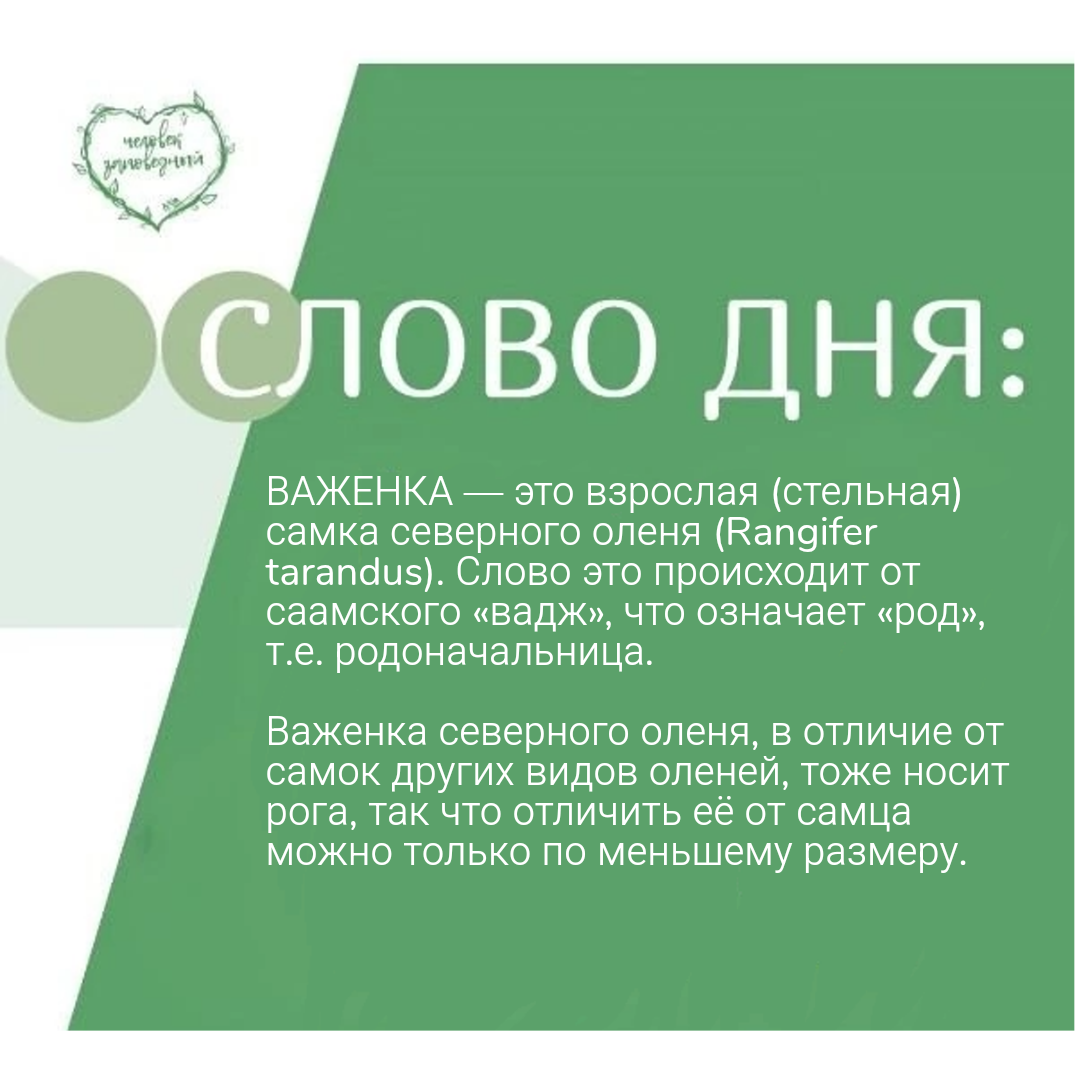 Так что в рубрике «Слово дня» узнаем, что половозрелых самок северного оленя называют особым словом «важенка». Слово это происходит от саамского «вадж», что означает «род», т.е. родоначальница.