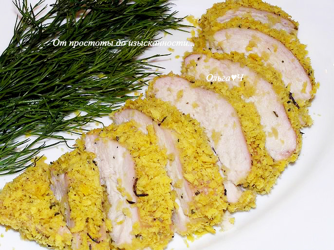 соль, перец по вкусу Приготовление: Смешайте панировку и базилик. Яйцо немного взбейте с молоком, посолите, поперчите. Куриные грудки обмакните в яичной смеси. Затем в панировочной. Выложите на противень, застеленный бумагой для выпечки. Запекайте при 200*С около 25-30 минут. Нарежьте и подавайте. Приятного аппетита! Вам также могут понравиться: