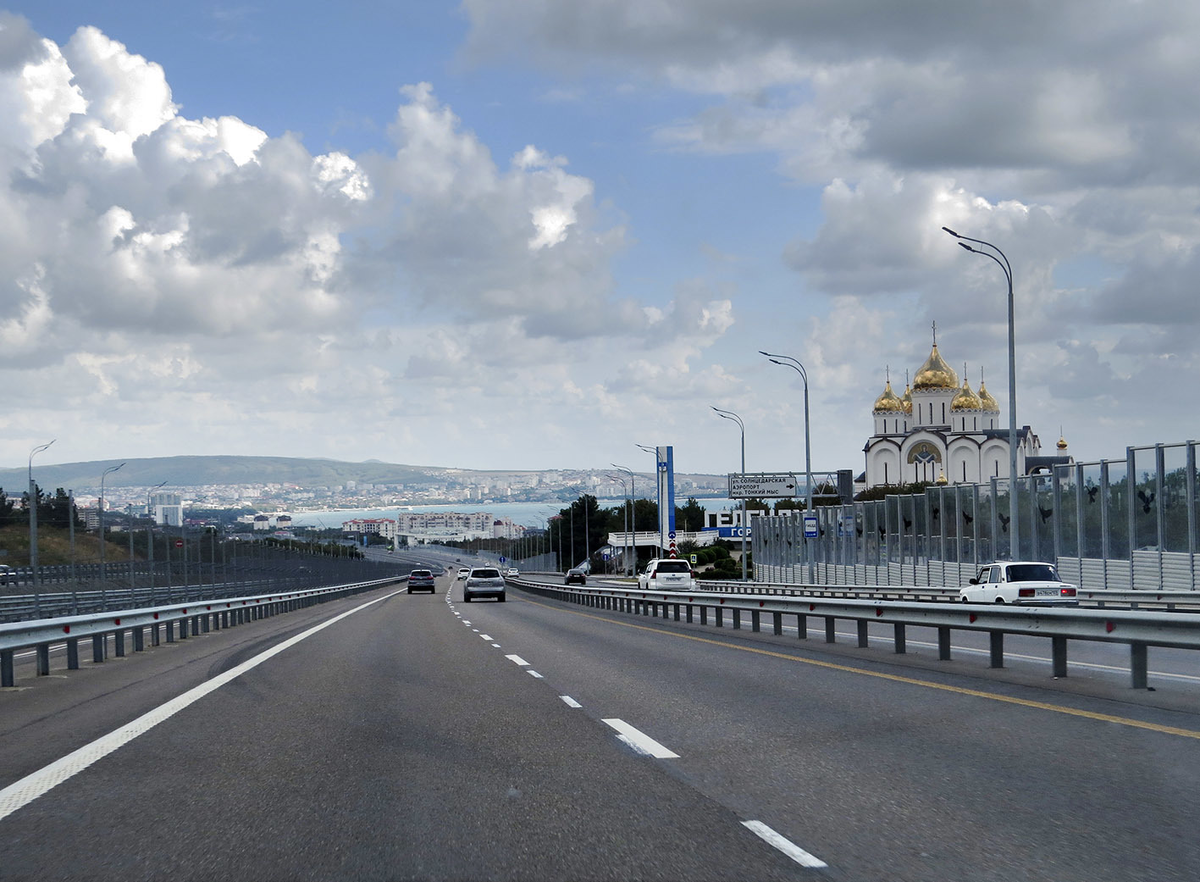 От Новороссийска, в котором есть вокзал, по трассе "Дон" рукой подать (километров 20-25) до Геленджика, встречающего огромным собором Андрея Первозванного (2014-22)... И стильными шумоуловителями с силуэтами хищных птиц, чтобы остальные птицы о них не бились: Трасса обходит город буквально по краешку. Но кое-что тут есть и выше трассы - это Маркотхский хребет: На его гребень ведут две канатных дороги. Западная (1600 метров, подъём 620м), олдам известная одним своим пассажиром, с 2003 года возит в Сафари-парк: Где можно, например, сходить вон в тот террариум с парком Юрского периода (зачем так высоко?!) или посмотреть на дольмен, в 2007 году собранный из завезенных в гору подлинных фрагментов. Восточная канатка парка "Олимп" чуть поменьше (1120м, подъём 430м) и помоложе (2011), но как я понимаю, с площадок около неё лучше виды. Особенно - от самого большого в России (43 метра, из которых 9 - основание) креста, в 2020 году поднятого на уступе. Перепад высоты тут реально серьёзный - вот э