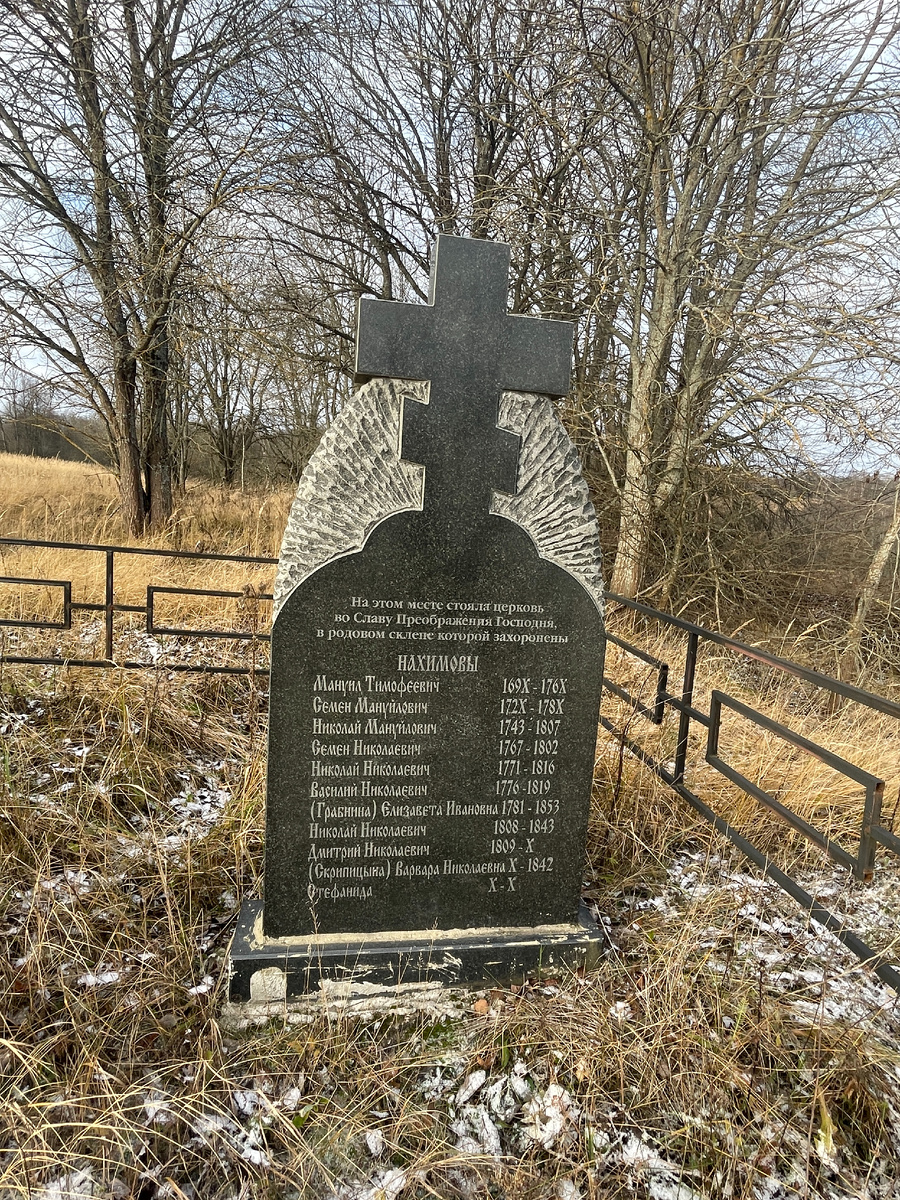 На этом месте стояла церковь во Славу Преображения Господня, в родовом склепе которой захоронены Нахимовы: