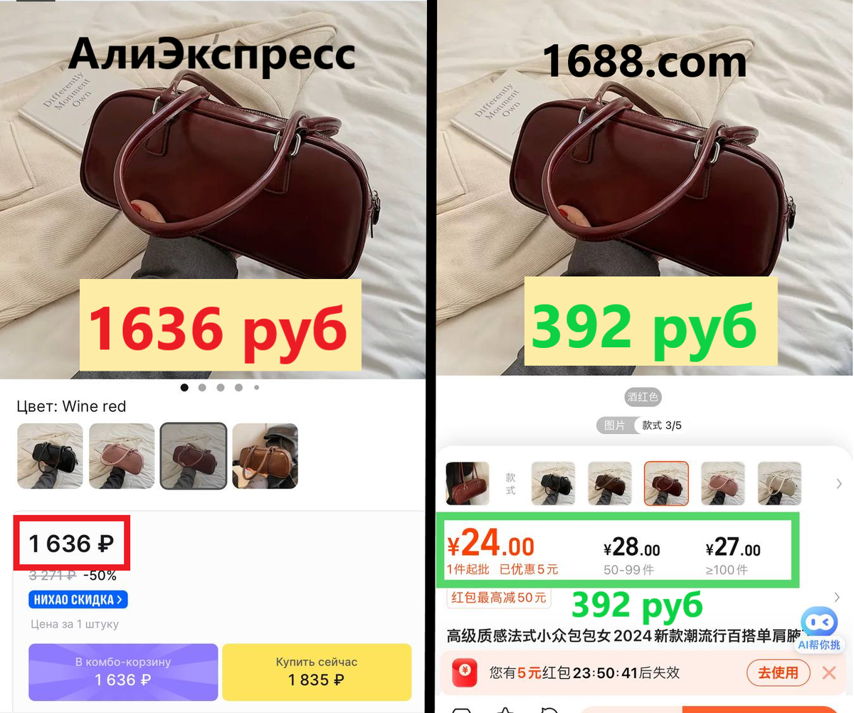 На 1688 ту же сумку можно купить за 28 юаней (при заказе от 50 шт.), что по текущему курсу примерно 392 ₽.