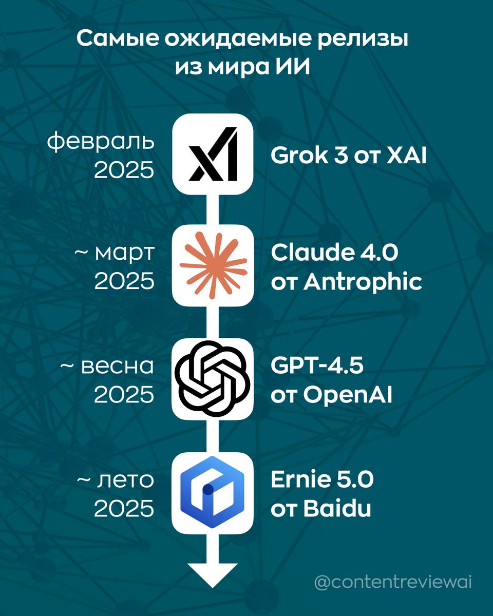 Февраль стал месяцем анонсов и тизеров от ИИ-компаний. Маск анонсировал презентацию, на которой покажет 3 версию модели Grok от компании xAI. Она состоится уже завтра в 7 утра. Пока единственное значимое преимущество Grok — возможность генерировать тексты и картинки с известными личностями без чрезмерной цензуры. Новую версию Маск называет «самым умным ИИ на Земле». Интересно увидеть, что сделала команда xAI. Anthropic уже через несколько недель может выпустить Claude 4.0, модель следующего поколения. Ожидается, что она тоже начнёт «думать» над ответом и динамически подстраивать время размышлений в зависимости от задачи. Почему это важно? Среди всех моделей у Claude, по ощущениям, самый «живой» и креативный «ум» (если можно так сказать). Ответы получаются менее формальными и отличаются от других нейросетей. Одновременно с этим OpenAI рассказали о своих планах — выпустить сразу две модели и упростить линейку своих продуктов. GPT-4.5 выйдет «в ближайшие недели» и будет последней нейросет