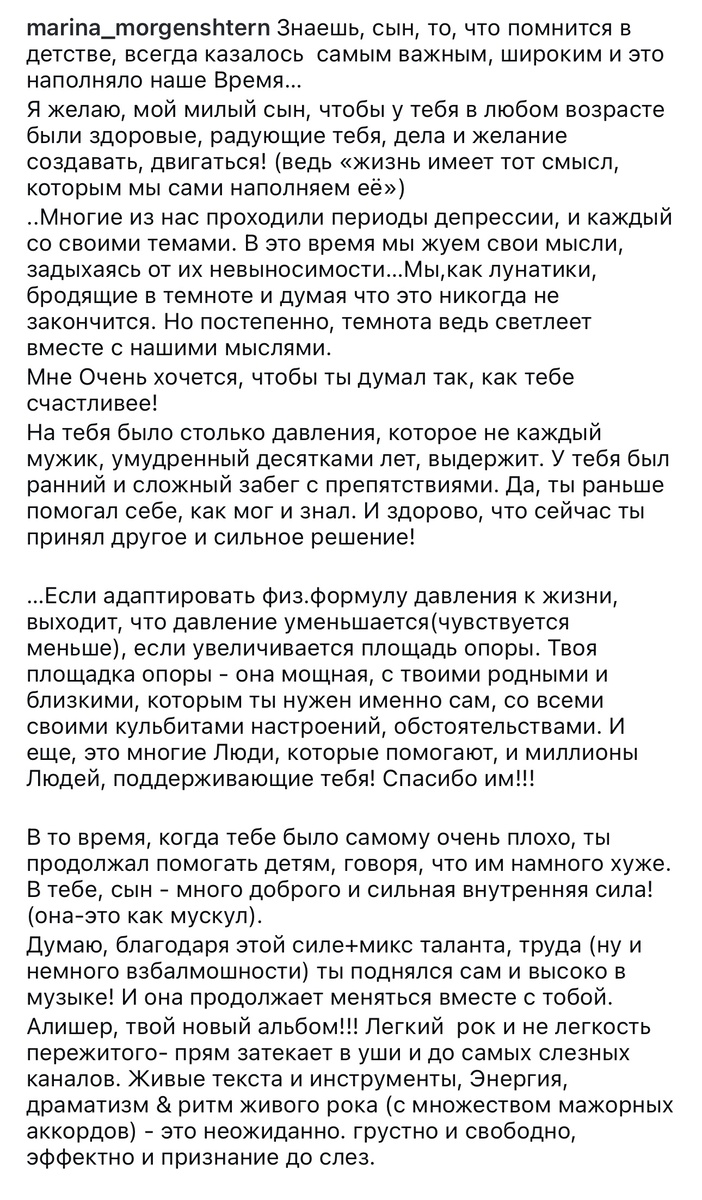 Сегодня, в день рождения «иностранного агента» (согласно реестру Министерства юстиции РФ) Алишера Моргенштерна его мама Марина поздравила скандального рэпера в запрещенной у нас соцсети: