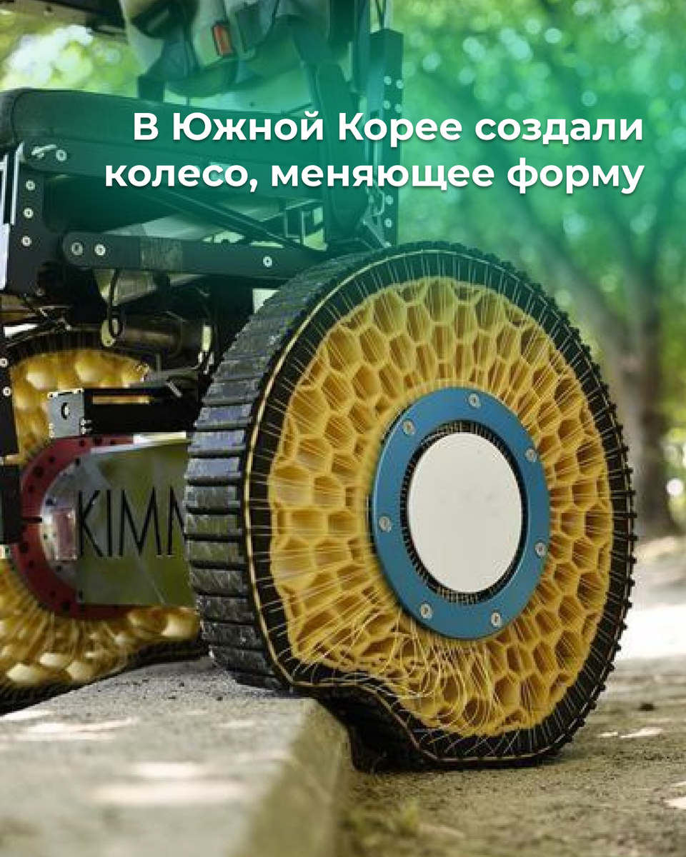 Инженеры из Южной Кореи (Корейский институт машин и материалов (KIMM)) продемонстрировали инновационное изобретение - систему колес с использованием технологии «морфинга». Система обеспечивает плавное изменение формы колеса, позволяя преодолевать различные препятствия, которые непреодолимы для колес традиционно круглой формы. Оснащенная «морфинг-колесами» инвалидная коляска способна справиться с бордюрами, неровностями поверхности и даже лестницами. Колеса могут преодолевать препятствия, высота которых в 1,3 раза превышает их радиус. У инженеров большие планы на изобретение - это, в том числе, и использование колес в сфере роботизированной доставки. Колеса позволят перевозить полезные грузы, требующие стабильного перемещения в промышленных условиях. Также цель состоит и в том, чтобы сделать колесо жизнеспособным для скорости до 100 км/ч, или скорости среднего автомобиля. На сегодняшний день команда инженеров успешно продемонстрировала прототип инвалидной коляски, установленной на транс
