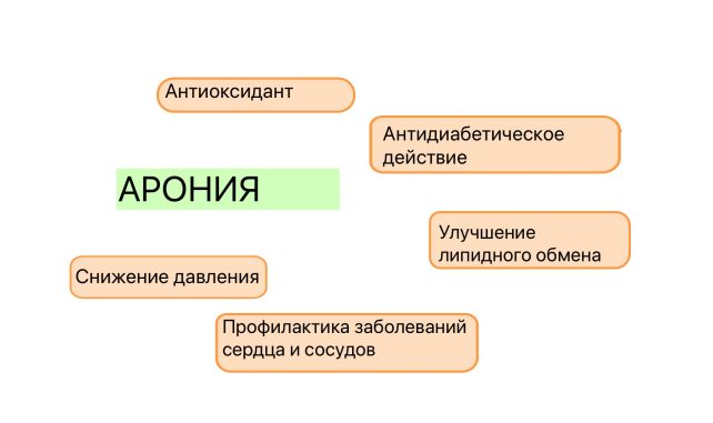 Арония – мощный природный источник ценных нутриентов для поддержки здоровья сердца и сосудов. Её регулярное употребление помогает снизить уровень холестерина и артериального давления, улучшить кровообращение, предотвратить воспаление и окислительный стресс, что делает её важным элементом профилактики сердечно сосудистых заболеваний. Включение аронии в рацион может быть полезным шагом для тех, кто заботится о своём сердце и хочет снизить риск возникновения серьёзных заболеваний. В состав ягод черноплодной рябины (аронии) входят витамины В1, В2, В4, В6, В9, С, Е, РР, Р - витаминные вещества (антоцианы, катехины, флавонолы), каротиноиды, органические кислоты (яблочная, лимонная, винная, салициловая), цинк, марганец, хром, медь, железо, калий, йод. Какими биологическими эффектами обладает арония? - Снижение артериального давления - Мочегонный эффект - Антиоксидантное действие (борьба со свободными радикалами) - Укрепление капилляров. - Помогает поддерживать правильный баланс липидов