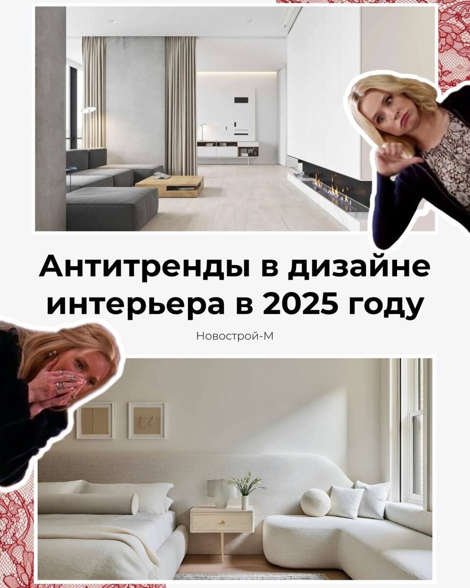 Следовать или нет модным тенденциям — личное решение каждого. Наша задача — донести информацию, и сегодня мы расскажем об антитрендах в дизайне интерьера в 2025 году. ⚡️ Новострой-М: подписывайся, в нашем телеграм-канале есть всё о новостройках Москвы и области (и не только) ✖️ Строгий минимализм сдает свои позиции и уступает место более ярким и индивидуальным подходам к оформлению интерьеров. Сегодня предпочтения смещаются в сторону персонализированных пространств, отражающих характер и увлечения их владельцев. Чтобы привнести уют и характер в интерьер, можно добавить живые растения и яркий текстиль с оригинальными принтами и интересными фактурами. Винтажные вещи, такие как бронзовые или латунные лампы, венские стулья или кашпо могут стать изюминкой интерьера. ✖️ Глянцевые фасады также начали отходить на второй план ввиду своей непрактичности. Натуральные материалы, такие как массив дерева или шпон, не только обладают визуальной привлекательностью, но и создают ощущение гармонии и свя