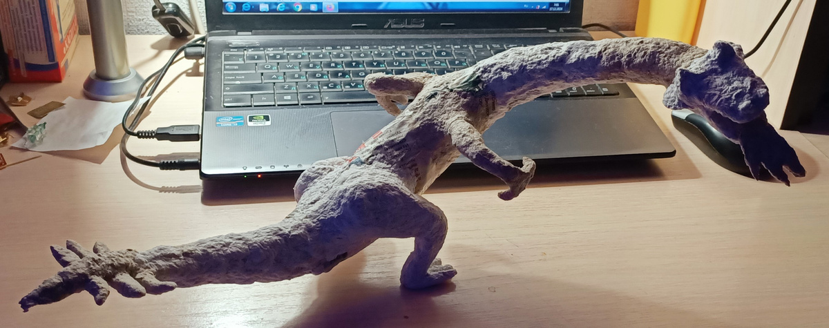 · Всем привет. Сегодня мы будем делать динозавра из туалетной бумаги🤣. Смотрите мои прошлые статьи по папье-маше. И не забывайте ставить лайки и подписываться на канал. · У динозавра изогнутое тело с шипами на спине. Ещё шипы находятся на хвосте. Глаза жёлтые. У динозавра открыт рот, из которого идёт пламя. Стоит он на двух лапах и две лапы у него висят в воздухе как у тиранозавра. · Начнём делать основную часть👀. C начала берём проволоку и обматываем её газетой (посередине должна быть самая большая часть). Потом облепливаем смесью. Надо чтобы было всё ровно. Затем берём ещё проволоку для ног и тоже обматываем газетами. И так же облепливаем смесью. Как сделать смесь показано в другой статье, читайте до конца👇. Лапы, которые висят делаем так же. Для головы надо скатать небольшой шарик из газет, затем облепить его смесью и налепить рот. Из рта должно идти пламя, его делать просто без проволоки и газет. · Красили его матовыми, акриловыми красками. Низ динозавра красили в красный, а ве