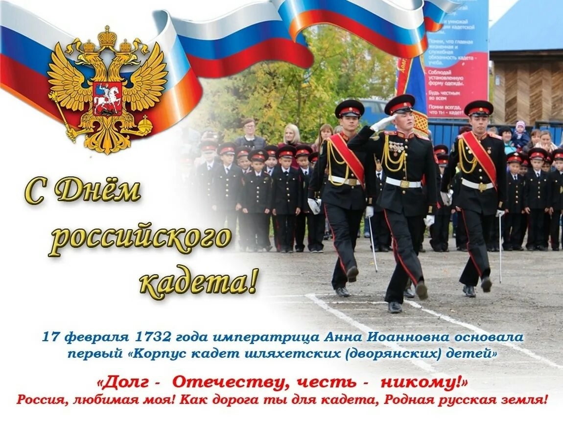День кадета России 17 февраля в России отмечается День кадета, дата которого приурочена ко дню создания первой школы для обучения детей дворян. В этот день (по старому стилю) 1732 года российская императрица Анна Иоанновна утвердила представленный генерал-фельдмаршалом Минихом план устройства «Корпуса кадетов шляхетских (дворянских) детей» в Санкт-Петербурге. Именно с этого времени и принято вести историю кадетских корпусов в России, а 17 февраля считать Днём российского кадета. Но стоит отметить, что существует и другая дата, предлагаемая для праздника – 14 января. В этот день в 1701 году по указу Петра I в Москве была создана «Школа навигацких и математических наук» для обучения молодых дворян морским наукам, ставшая прообразом Морского кадетского корпуса. И все же наиболее популярна дата 17 февраля. В настоящее время в России кадетское образование активно возрождается – появляются и действуют кадетские училища, корпуса, школы, классы и т.д. при различных российских ведомствах Минобо