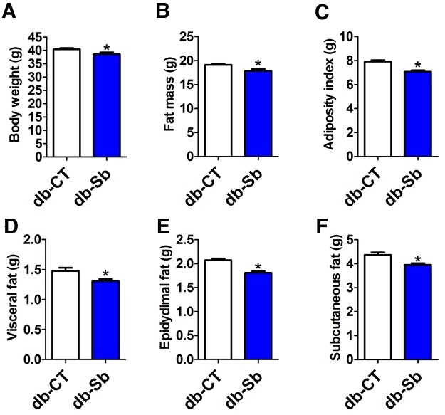 Body weight (a), fat mass measured by nuclear magnetic resonance (b), the adiposity index (c), visceral adipose tissue weight (d), epididymal adipose tissue weight (e), and subcutaneous adipose tissue (f) were measured in db/db mice treated with the vehicle (saline; db-CT; n = 15) or S. boulardii (db-Sb; n = 15). Data are means ± SEM. *, P < 0.05 according to Student's t test.