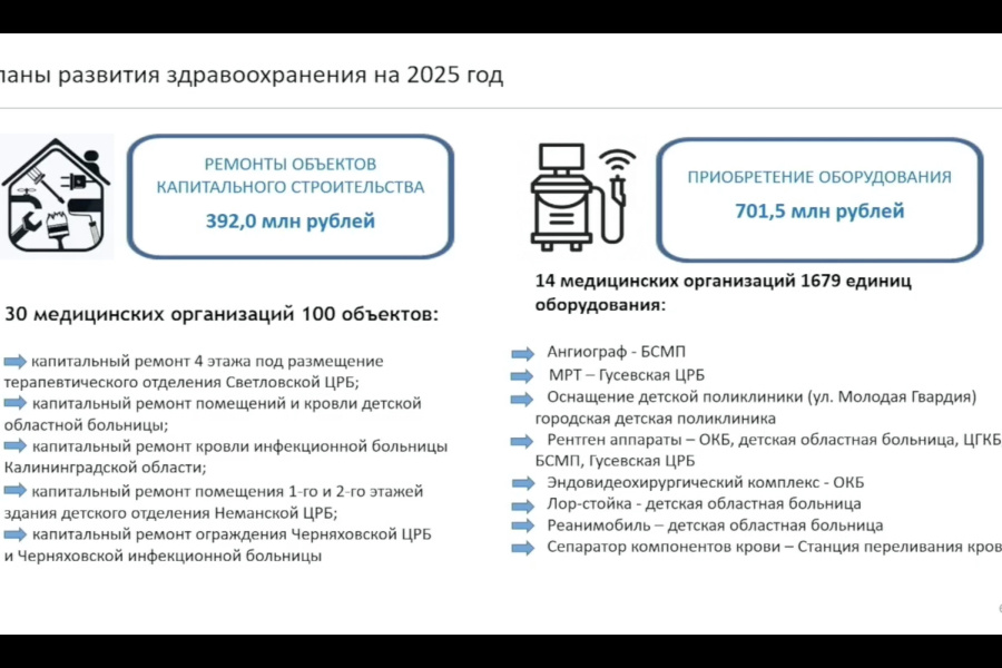 На приобретение оборудования для больниц Калининградской области в 2025 году предусмотрели более 700 млн рублей. Об этом на оперативном совещании правительства региона 17 февраля заявил министр здравоохранения Сергей Дмитриев. Как пояснил чиновник, средства выделены в том числе и для замены старого оснащения. Всего планируется закупить 1679 единиц оборудования для 14 медицинских учреждений региона. На эти цели предусмотрено 701,5 млн рублей. «Плюс мы ожидаем в этом году приобретение ангиографа для БСМП и МРТ для гусевской больницы, которая нам позволит реализовывать мероприятия в рамках оказания помощи пациентам с сердечно-сосудистыми заболеваниями и нарушениями мозгового кровообращения», — заявил министр. Изображение: скриншот презентации министра здравоохранения на совещании правительства Калининградской области Дмитриев также отметил, что на ремонт зданий медицинских организаций в 2025 году выделили 392 млн рублей. Работы планируют провести в 30 учреждениях. Помимо этого, по словам