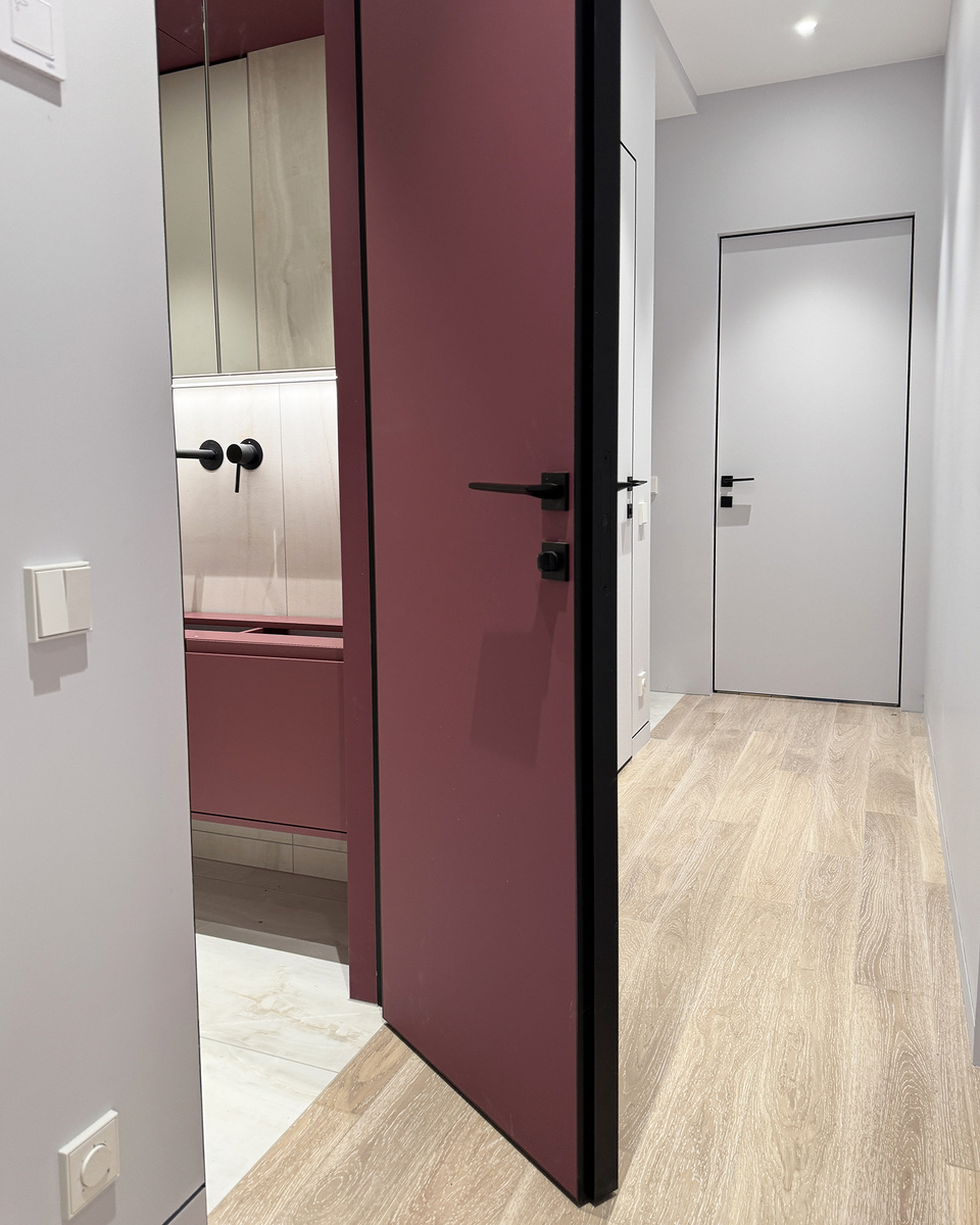 Все двери одного цвета, но одно из полотен двустороннее — эта дверь ведёт в санузел, где по задумке дизайнера в интерьере используется насыщенный винный цвет, поэтому с внутренней стороны дверь выполнена в ином оттенке.