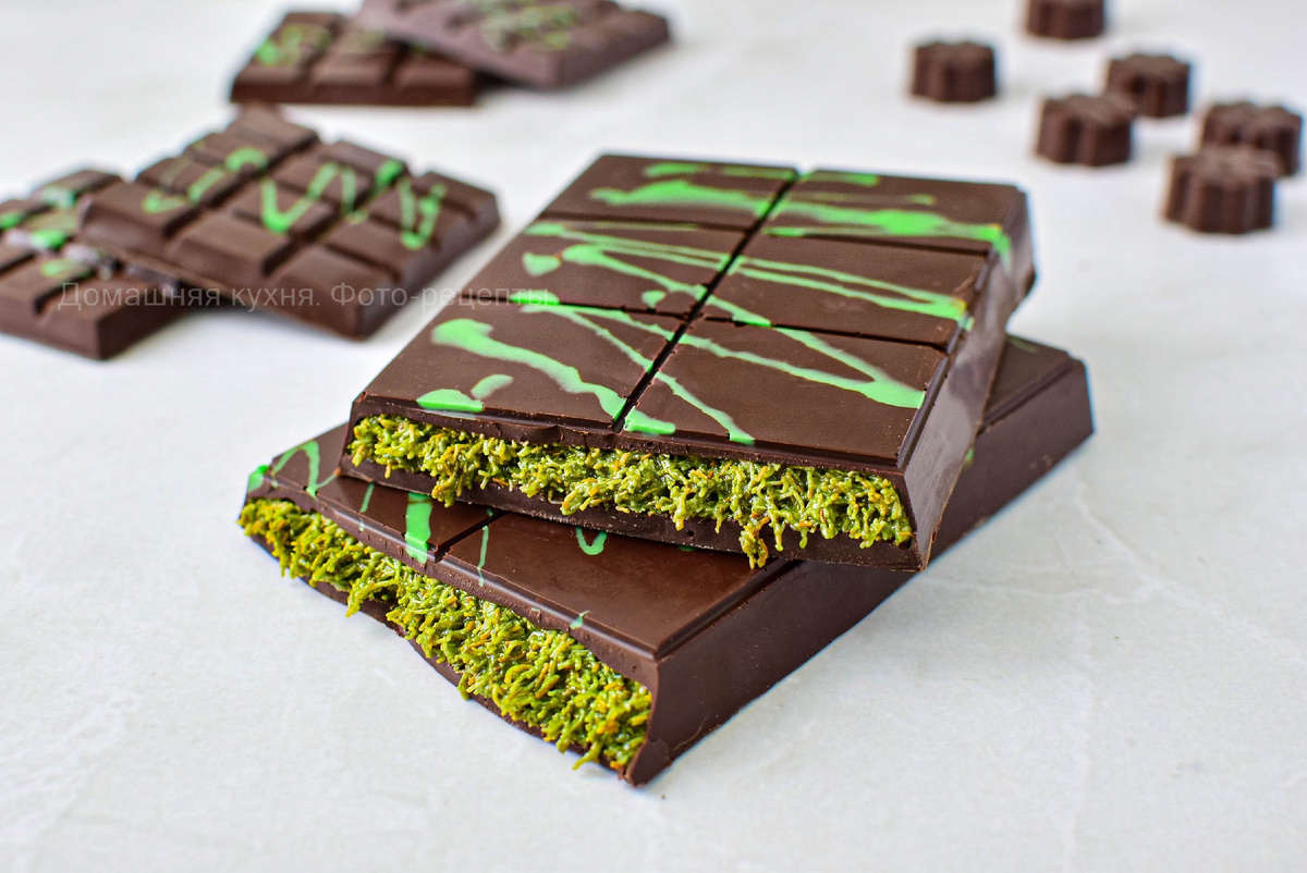 Премиальный шоколад с фисташковой начинкой стал настолько популярный, что не осталось ни одного человека, кто о нём бы не слышал. Такое уникальное угощение можно приготовить и дома. Это стоит того, чтобы попробовать его хотя бы раз в жизни! Для приготовления шоколада подготовьте необходимые ингредиенты. Тесто катаифи можно приготовить самостоятельно или купить готовое. Я беру готовое, уже обжаренное. Оно представляет собой очень тонкие полосочки теста. В домашних условиях врятли получится сделать так тонко. Для заливки шоколада подойдут любые силиконовые формы, подходящей глубины. Белый шоколад растопите и покрасьте в зеленый или желтый цвет. Нанесите по форме произвольный рисунок. Дайте ему застыть. Для начинки смешайте тесто катаифи, фисташковую пасту и тахини. В зависимости от густоты фисташковой пасты, её может понадобиться чуть больше или меньше. Ориентируйтесь на желаемую консистенцию. Начинка не должна быть слишком жидкой или сухой. Цвет готовой начинки будет зависеть от цвета